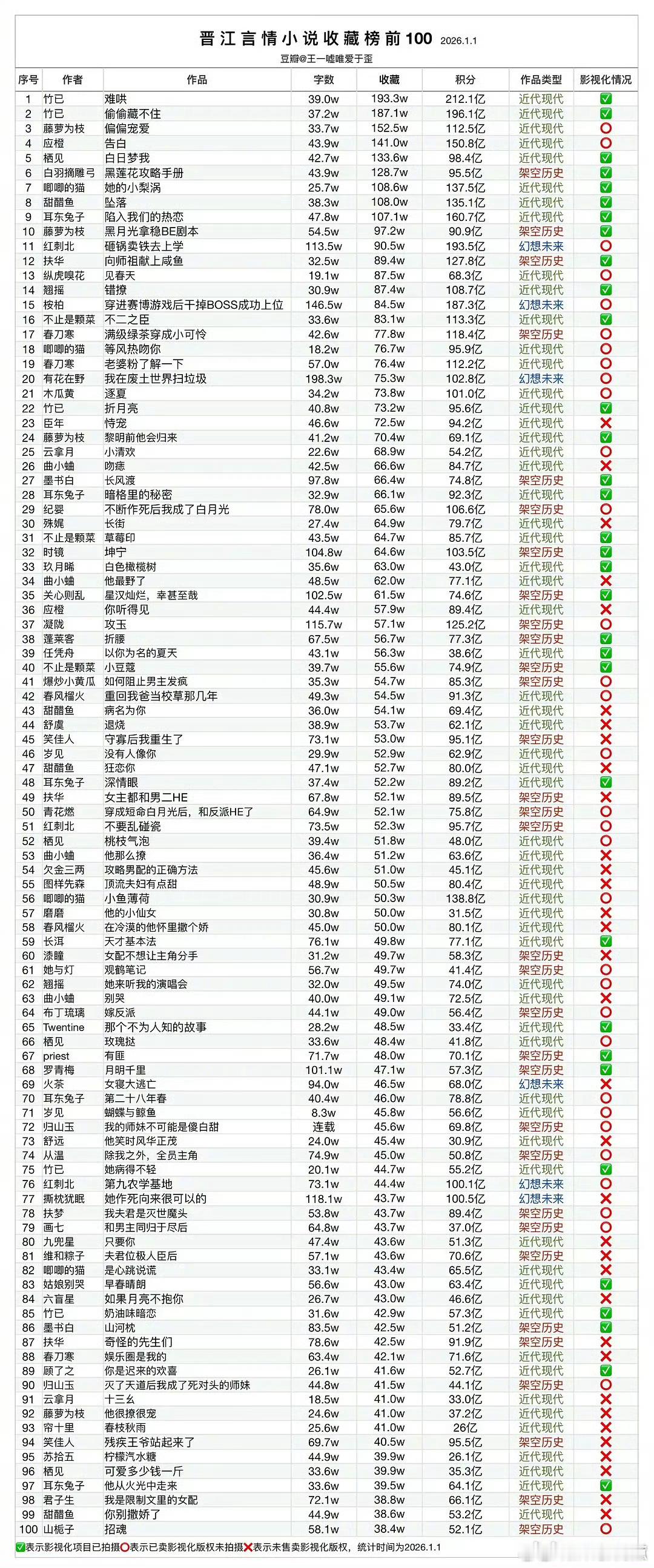 晋江言情小说收藏榜前100影视化情况留给小说妹的房子不多了里边影视化的有多少是