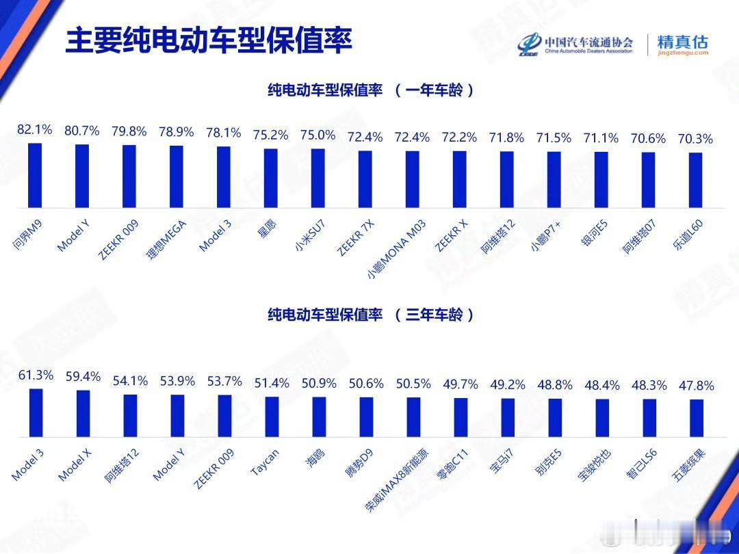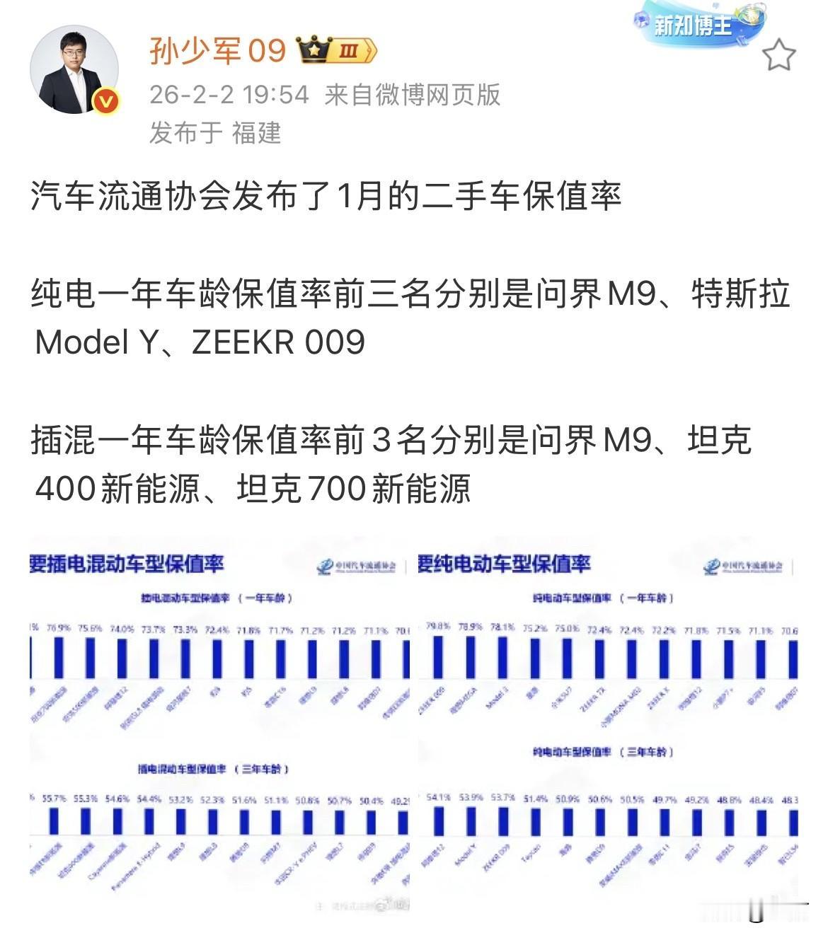 孙少军:上个月的二手车保值率出来了! 就在刚才,孙少军转发了汽车流通协会的,二手车保值率,这次的保值率分为两个车型,一个是纯电的 ,一个是插混的。 同时这两个车型也要分这个车的车龄,现在都是一年左右的,目前来纯排名前三的,应该是无可争议的,但是与之前大家了解的榜单还是有一点不一样的! 他们分别是:问界M9 这个车从一出来,就在50万左右的空间,保持比较稳定 ,而且这种势头已经连续保持三年以上,所以上个月他的表现,依然是稳稳当当的,就是大家熟悉的排名头一个。 第二名是特斯拉的Model Y 这个车不但在30万左右的空间里面,在全球范围内是卖得比较好的,而且他的车龄在一年左右的保质率也是比较靠前的,所以他在上个月的这个成绩并不意外。 第三名是极氪的009 这个车一出来就号称杭州湾库里南,无论是在外观造型,还是它的整体质量,以及用材用料,和综合配置与它的售价相比,都经过了时间的考验,看来在扎扎实实做车这方面,二手车的行情确是哪个反映这个车的质量。 另外一个类型就是插混,排名投一个的还是问界M9,不过第二个和第三个就有点不一样了,分别是坦克的400新能源,和700新能源。 这样能够看得出来,在插混这个领域里面,这种大型的越野车,再加小SUV的品牌价值,以及它的技术底蕴,确实在二手市场比较受欢迎。
