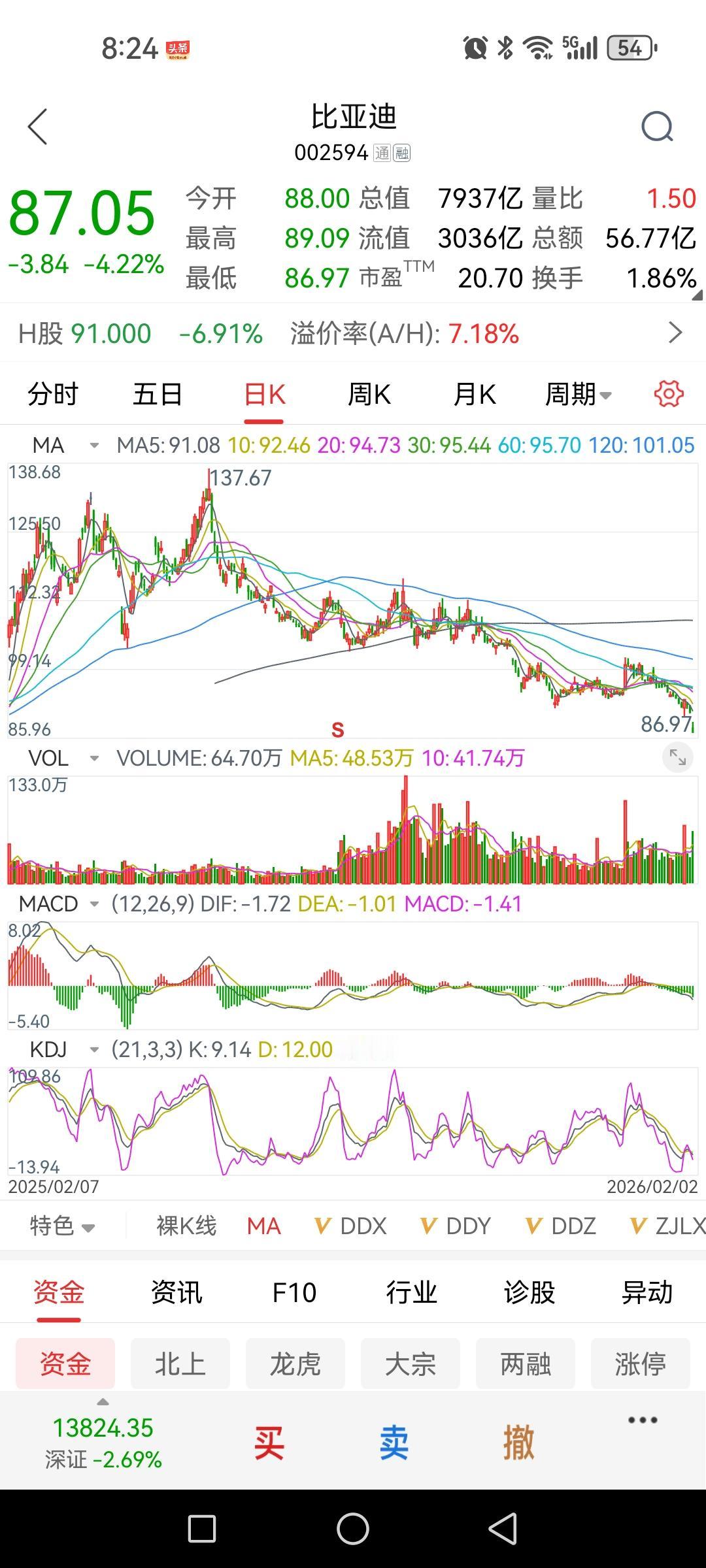 比亚迪,股票一旦走到下坡,刹车片踩冒烟了也刹不住。 本来这段时间的疯牛与它也无关,别人是涨了几十个点乃至翻倍才开始杀跌回调,可你却一直在走下坡,咋个人家大跌的时候你也掺乎个啥,跳空低开大跌超4%。 137跌到87跌幅达到36%了,下跌时间也长达8个月了,呆在里面的人每日煎熬着问:大霄不是天天喊买好股票吗?这不算好股票吗? 有句话重复一下——买好的不如买得好。所以价值投资改为价值投机在A股里才能生存。