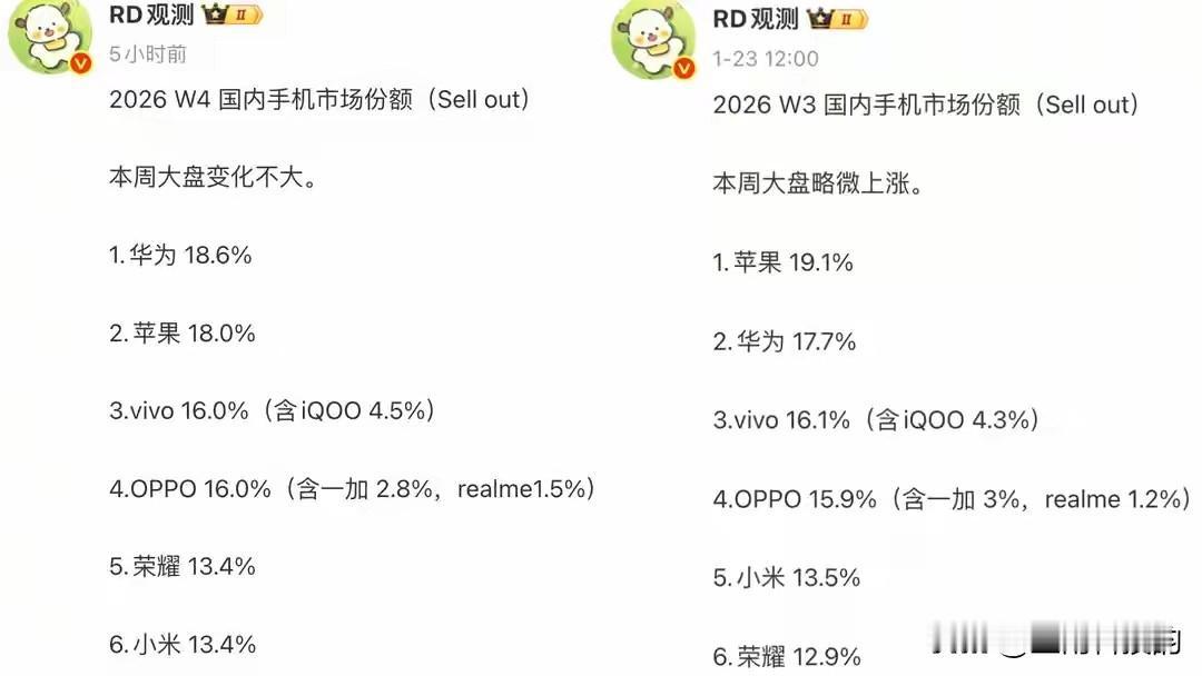 新鲜出炉!2026年第4周的国内手机畅销榜来了,华为Mate8第5,vivo S50第8,iPhone17第2,第一名遥遥领先! 苹果这波直接杀疯了,iPhone 17系列包揽前三,Pro Max更是断层第一。不得不承认,苹果是真的懂消费者,标准版给足了256GB存储,还配上高刷屏,再加上国补加持,吸引力直接拉满。Pro Max的顶级体验和iOS生态,更是让高端用户心甘情愿买单。 但最提气的还是华为!在苹果的包围下,华为Mate 80硬杀进前十,成了前十里唯一的国产旗舰。往前三十名看,华为手机有不少。这背后是麒麟芯片回归的硬实力,也是鸿蒙生态的底气。能在高端市场站稳脚跟,华为真的给国产手机争了口气。 前十里剩下的基本都是vivo、OPPO、荣耀的中端和千元机,主打实用性价比,自拍、抗摔、长续航这些刚需抓得很准,也是大众市场的主力军。 现在用户选手机越来越理性,要么认苹果的综合体验和生态,要么信华为的自研技术,中端机就看性价比和实用功能。希望其他国产厂商也能加把劲,在高端市场多来点突破,期待下次榜单能看到更多国产旗舰的身影! 2026手机畅销榜 苹果华为手机市场比拼 HUAWEI/华为畅享80 256GB 鸿蒙智能手机 大电池长续航抗摔