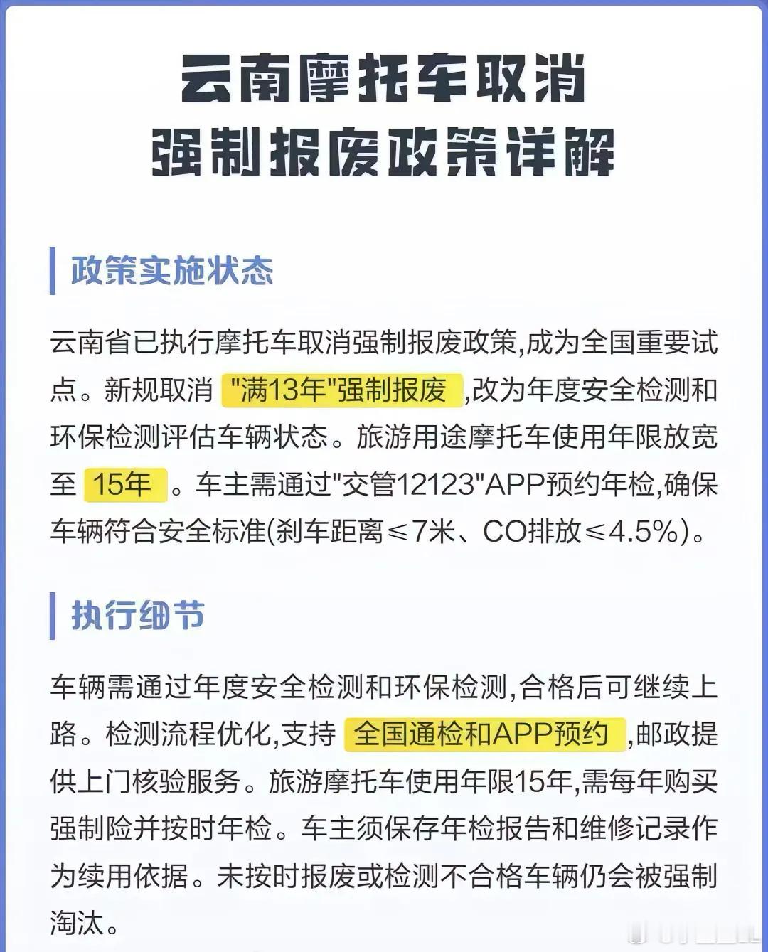 云南取消摩托车13年强制报废政策了?