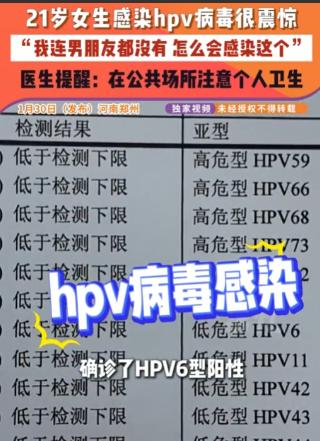 河南郑州,21岁女子洗澡时发现下体长很多肉疙瘩,母亲带她去检查,竟被确诊HPV6型阳性。女子称自己连男朋友都没有,不可能这样啊,母亲愤怒质问,医生解释该病80%通过性传播,但还有20%是间接传播,如果用了污染过的毛巾、床单等也会被传染,母女俩恍然大悟,女子恐慌减轻但仍后怕。 那天晚上,姑娘像往常一样洗澡,手无意间碰到下体时,感觉不对劲,仔细一摸,竟然长了一片小小的肉疙瘩,不疼不痒,但摸起来格外突兀。 姑娘瞬间慌了神,连忙喊来妈妈。 妈妈冲进浴室,一看女儿指的地方,脸瞬间白了,连夜就盘算着第二天一早带女儿去医院。 第二天,母女俩赶去了市里的三甲医院,挂了皮肤科的号,接诊的女医生仔细检查后,开了HPV检测的单子。 等待结果的那两天,姑娘寝食难安,晚上翻来覆去睡不着,总忍不住胡思乱想,妈妈也愁得吃不下饭,时不时就唉声叹气。 直到检测结果出来,上面赫然写着HPV6型阳性,母女俩拿着单子,脸色都沉了下来。 妈妈急切地拉着医生追问,这病到底是怎么得的,医生解释,HPV6型属于低危型人乳头瘤病毒,大多会引起尖锐湿疣这类良性病变,而这种病毒,80%以上都是通过性接触传播的。 这话刚说完,妈妈瞬间急了,猛地转过身,声音一下子提高,对着女儿质问,是不是偷偷交了男朋友,是不是瞒着家里做了不该做的事。 姑娘当场就哭了,眼泪止不住地往下掉,反复辩解,自己真的没有交过男朋友,连男孩子的手都没牵过,怎么可能通过这种方式感染。 看着女儿哭得撕心裂肺的样子,不像是在撒谎,妈妈也愣了,既生气又心疼,一时不知道该怎么办。 医生见状,连忙拦住母女俩,笑着安抚,说自己的话还没说完。 虽然性接触是主要传播途径,但还有20%的可能是间接传播,比如使用了被病毒污染过的毛巾、浴巾、床单,或者坐了不洁的公共坐便器,在消毒不严格的公共浴池、游泳池接触到病毒,都有可能被感染。 医生补充说,HPV病毒在潮湿的环境里能存活一段时间,只要皮肤有微小的破损,接触到病毒,就有可能被传染,这种间接传播的情况,虽然概率不如性传播高,但也很常见,尤其是年轻人,平时不太注意个人卫生和公共卫生,很容易忽略这种风险。 听了医生的解释,母女俩才恍然大悟,妈妈的火气一下子就消了,反而有些愧疚,不该不分青红皂白就质问女儿。 姑娘心里的石头也落了地,恐慌减轻了不少,但一想到自己没做过任何出格的事,却还是感染了病毒,依旧有些后怕。 其实这件事,也给很多人提了个醒,很多人都误以为,HPV感染就一定和性生活有关,甚至会对感染者另眼相看,这其实是很大的认知误区。 HPV感染很常见,低危型的大多不会致癌,只要规范治疗、定期复查,大多能转阴,而且间接传播的风险,往往被我们忽略了。 平时出门住酒店,尽量自带毛巾、浴巾和床单,不要用酒店里的公共用品;去公共浴池、游泳池,也要做好防护,尽量避免直接接触公共设施;家里的个人用品,也不要和别人共用,定期消毒,养成良好的卫生习惯,才能减少间接感染的可能。 姑娘后续按照医生的建议,规范治疗、定期复查,没过多久,病毒就转阴了,母女俩也终于松了口气。 这件事没有什么夸张的情节,却很真实,也很有警示意义,毕竟很多人都在忽视这种隐形的风险。 对此您有什么不同的看法,可以在评论区留言讨论!!!