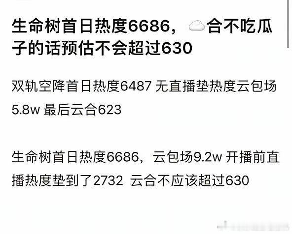 《生命树》首播云合居然和《双轨》差不多《双轨》是虞书欣和何与主演,配角一个都不认识,空降无直播垫热度,云包场5.8w最后云合623,首日热度6487《生命树》正午年度大剧,最强班底,杨紫主演,胡歌,梅婷一众实力派做配。云包场9.2w,开播前热度垫到了2732,首日热度也不过才6686,最后云合估计不超过630