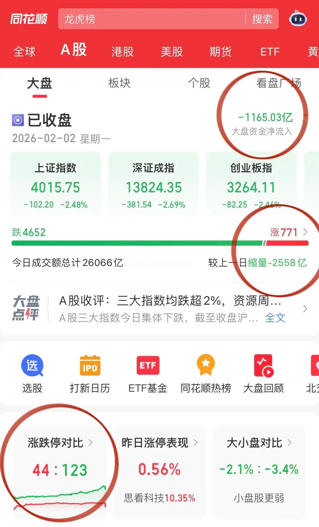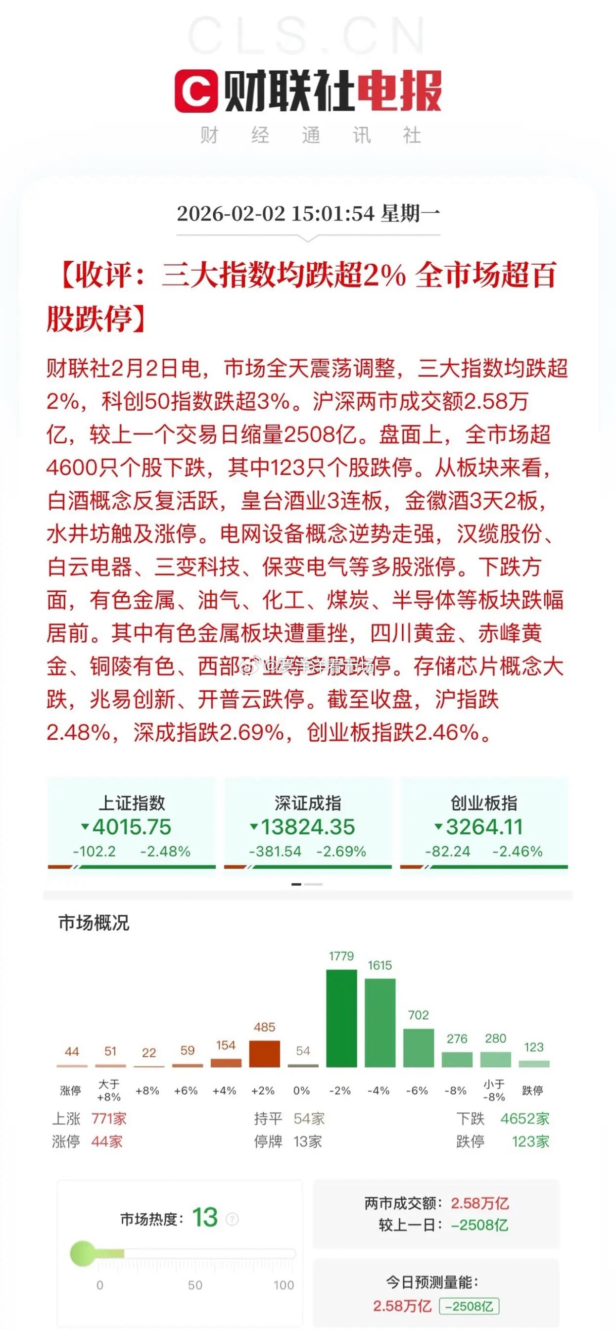 收评,护盘不敢护流星飞瀑!沪指百点长阴,沪深300ETF有过两小波护盘,没什么太大的作用,上方也有意让市场调一调、洗一洗。涨跌停比44:123有色金属跌停潮是预期内的,今天储存芯片杀了个通透杀伤力极大!14:00之前的盘面都还好,抛去有色金属其它并不差,尾盘半小时泥沙俱下了!系统性下跌的时候,盘面也没什么可斤斤计较的,手上有子弹看好的方向开始分批入手就好。没什么不得了的,3815以来连阳涨幅后回吐一半甚至2/3都正常,如果外围风险扩散回调指数10%都正常。牛市多急跌,没什么问题啰,牢记主线、抓牢主线、只玩主线,明白没有!