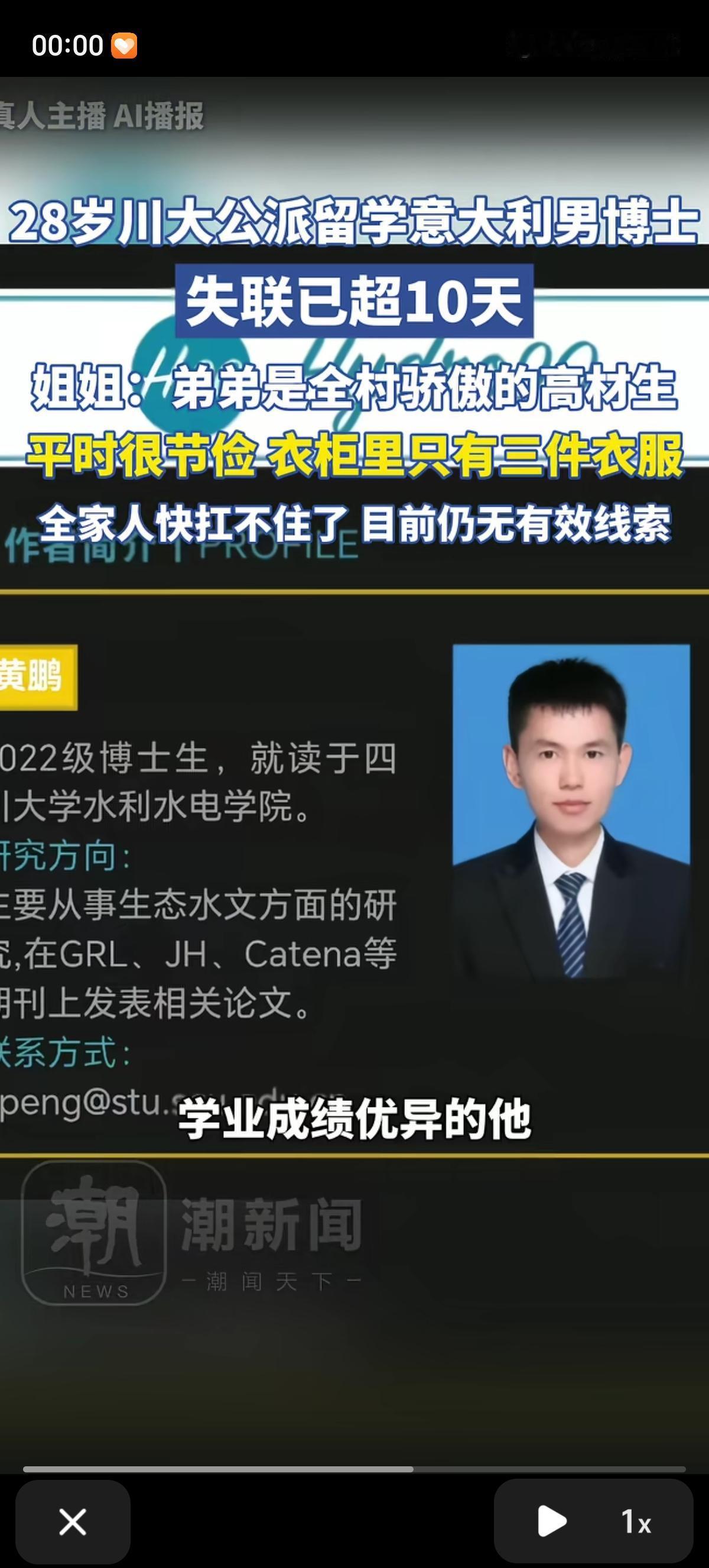 28岁川大公派留学意大利男博士,失联已经超过10天了。他姐姐哽咽的说:“弟弟平日很节俭,是全村骄傲的高材生”。 2月2日当事人黄鹏的姐姐告诉记者,家里90多岁的爷爷奶奶卧病在床,爸妈也倒下了,全家人都快撑不住了。 黄鹏是川大水利水电学院的博士生,去年8月份的时候公派前往意大利,是去多洛米蒂山区做生态水文考察,最后露面的时间是1月20日,到现在还没找到,失联了10多天了。 来自贵州农村的黄鹏学习成绩十分好,拿过很多奖学金,还发表过多篇高质量的论文,平时生活节俭。在意大利的衣柜里只有3件衣服,在国内的食堂经常只吃几块钱的饭。他是全村的骄傲,从大学时就背负助学贷款,全家人倾尽所有的供他读书。 黄鹏的姐姐正准备前往意大利寻找弟弟,到时会有学校派的老师陪着她一块去。希望一切顺利吧!