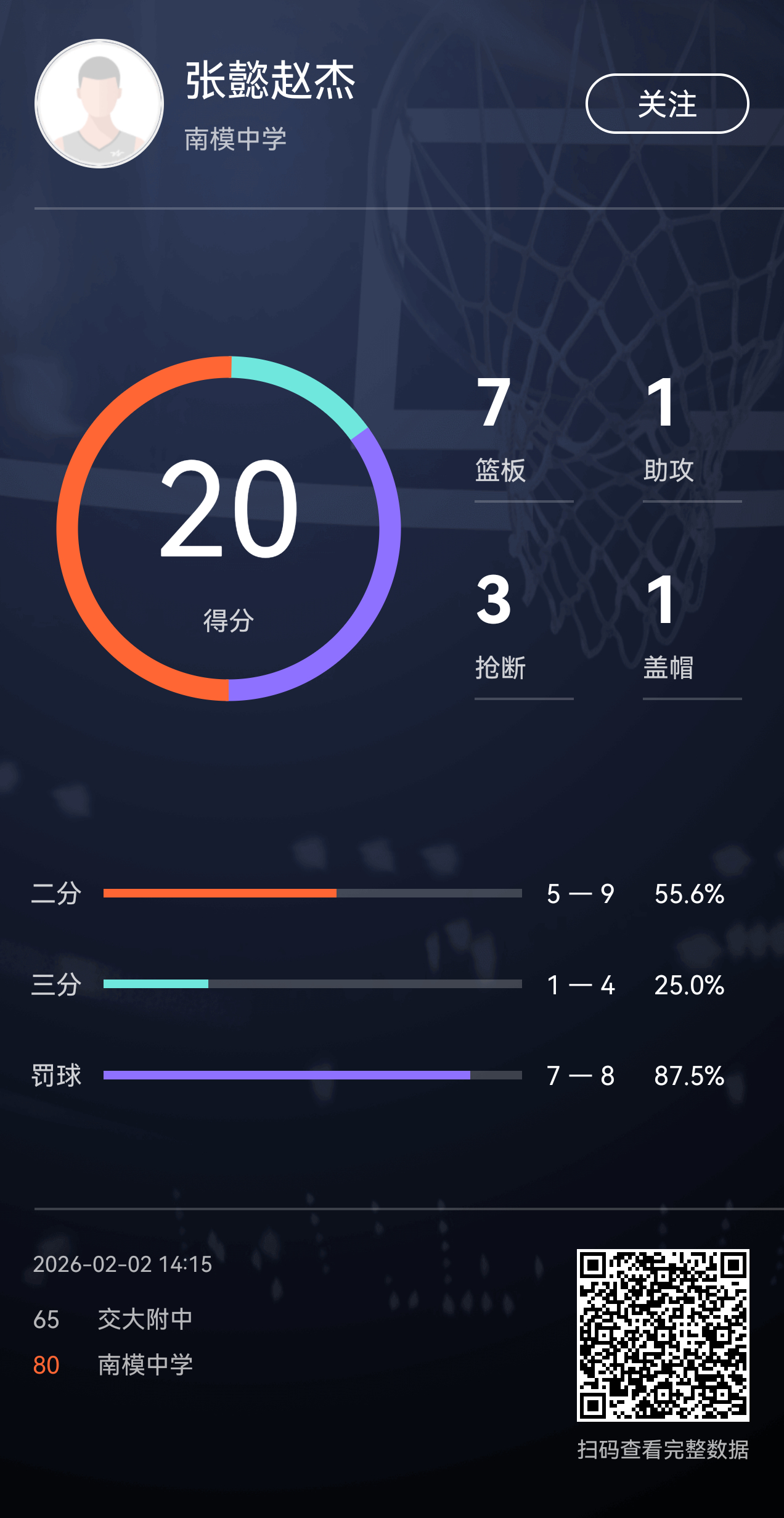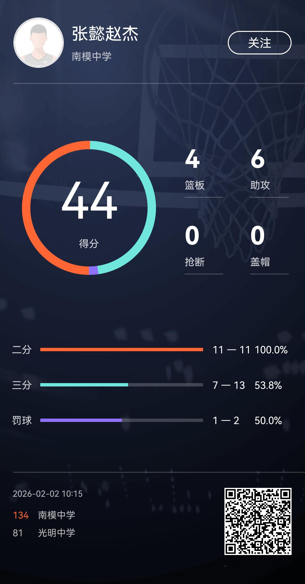 张懿赵杰今天在耐高上海基层赛打了两场球,一场20分7篮板,1场44分4篮板6助攻