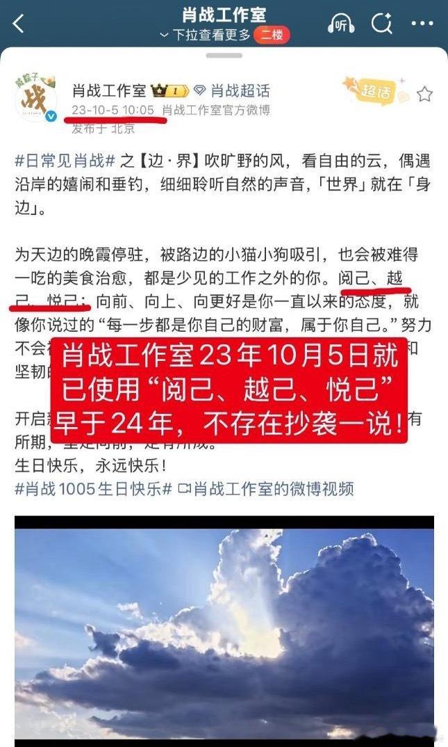 摩托姐姐stop🤚停止造谣。肖战工作室23年生日文案里就有“阅己,越己,悦己”这三个词了,王姓明星24年工作室年度总结文案也没有这个词,只是他热搜里的yxh用了这个文案。