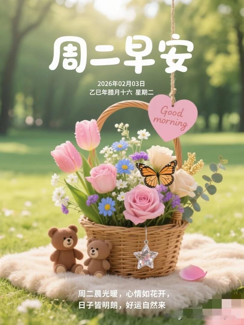周二的美好,从清晨的早安开始~愿朝阳温暖你的眉眼,温柔治愈你的所有,今日事事顺心,平安喜乐~ ​ 早安,新的周二~不慌不忙,向阳而行,愿你在平凡的日子里,收获不平凡的温暖与美好,一切皆顺~ ​  周二早安~愿你带着热爱与期待,奔赴今日的生活,眼里有光,心中有爱~ ​ 新的周二,新的开始,早安~愿所有的美好如期而至,所有的烦恼烟消云散,日子温柔,岁岁年年~ ​ 周二清晨,道一声早安~愿你被世界温柔以待,三餐四季,温暖相伴,事事顺意,平安喜乐~ 周二 早安
