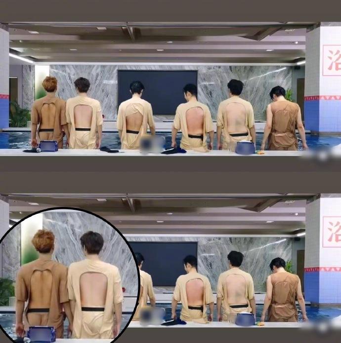 黄子韬这下脸丢大了,不说他的后背整个比刘耀文黑了多少个度,就说他的裤子也让人一言难尽,连黄子韬自己也恼羞成怒的质问节目组为什么不给他打码? 黄子韬最近参与了《宇宙闪烁请注意》节目的录制。 最近一期节目跟着东北人于洋来到了哈尔滨,体验冰雪城以及搓澡文化。 搓澡在东北还是挺有讲究的! 尤其是年前搓澡可以带走一年的晦气,新的一年重新出发。 因为节目组就让爆闪团的哥几个,把自己想要擦掉的三个人生污点,写在自己的后背上,最后再通过游戏互相搓背,把人生污点都搓走。 黄子韬让哥几个帮忙,在他的后背上写上远离蠢人和害他的人;然后在黄晓明的提议下又加上了远离脂肪。 节目组可能是觉得黄晓明、于洋、王鹤棣、黄子韬、邵子恒和刘耀文几个大男生都光着膀子不合适,于是就让大家穿上了这件经过特殊设计的露背短袖。 哥几个在澡堂子里通过玩游戏的方式,互相泼水搓背,最后大家的衣服基本上都湿了。 最后黄子韬尴尬了,皮肤黑,裤子本来和皮肤颜色靠近又贴在了身上,别提多尴尬了。 大家看看照片就知道了具体怎么回事了!