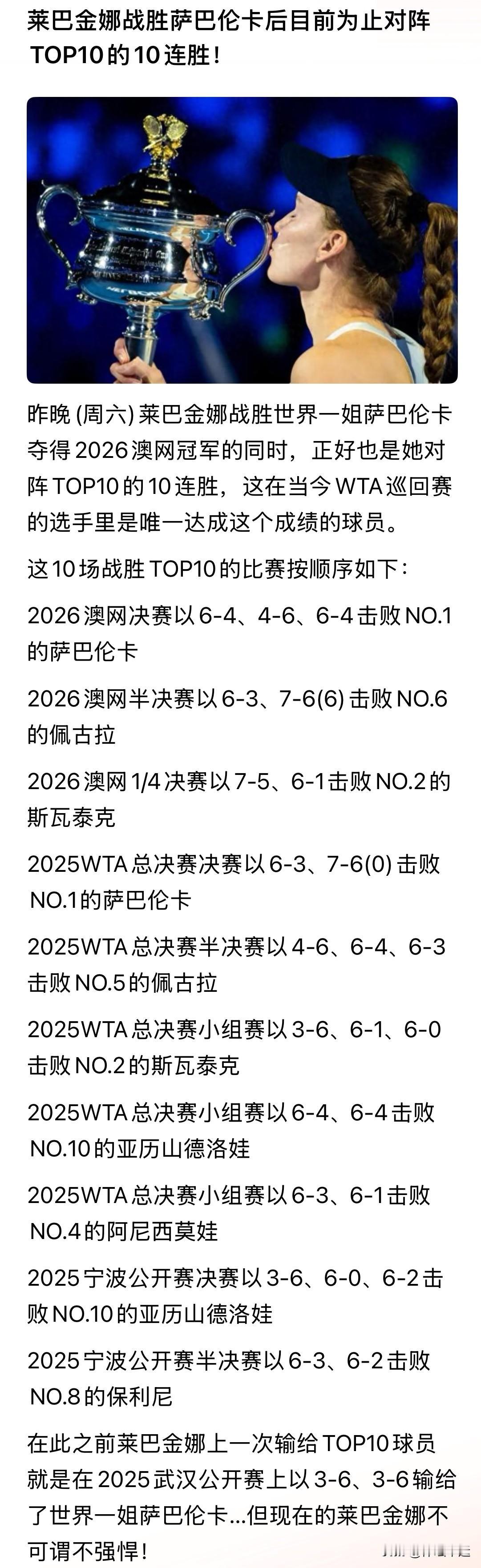 🆕记录👍👍 ✅莱巴金娜这对阵WTA世界排名前十的十连胜战绩,简直逆天了! 北京时间1月31日,她在澳网决赛击败世界第一萨巴伦卡,达成这一惊人成就。回顾这十场胜利,从2025年宁波公开赛到2026年澳网,她一路战胜了众多排名前十的高手。像斯瓦泰克、佩古拉、阿尼西莫娃、保利尼、亚历山德罗娃等都败在她拍下。 2022年她就拿过温网冠军,这次澳网夺冠是第二冠,还成了亚洲首位集齐草地与硬地大满贯的球员。之前输给萨巴伦卡,这次直接完成“复仇”。萨巴伦卡连续两年澳网亚军,而莱巴金娜却越战越勇,这战绩太牛了!