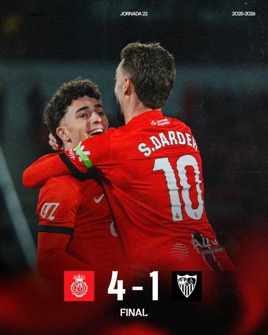 📌 西甲第22轮,马洛卡主场4-1大胜塞维利亚,穆里奇点射+助攻,萨穆·科斯塔、达德尔、帕布罗·托雷下半场连入三球,塞维利亚仅靠莫派补时扳平,最终无缘连胜。