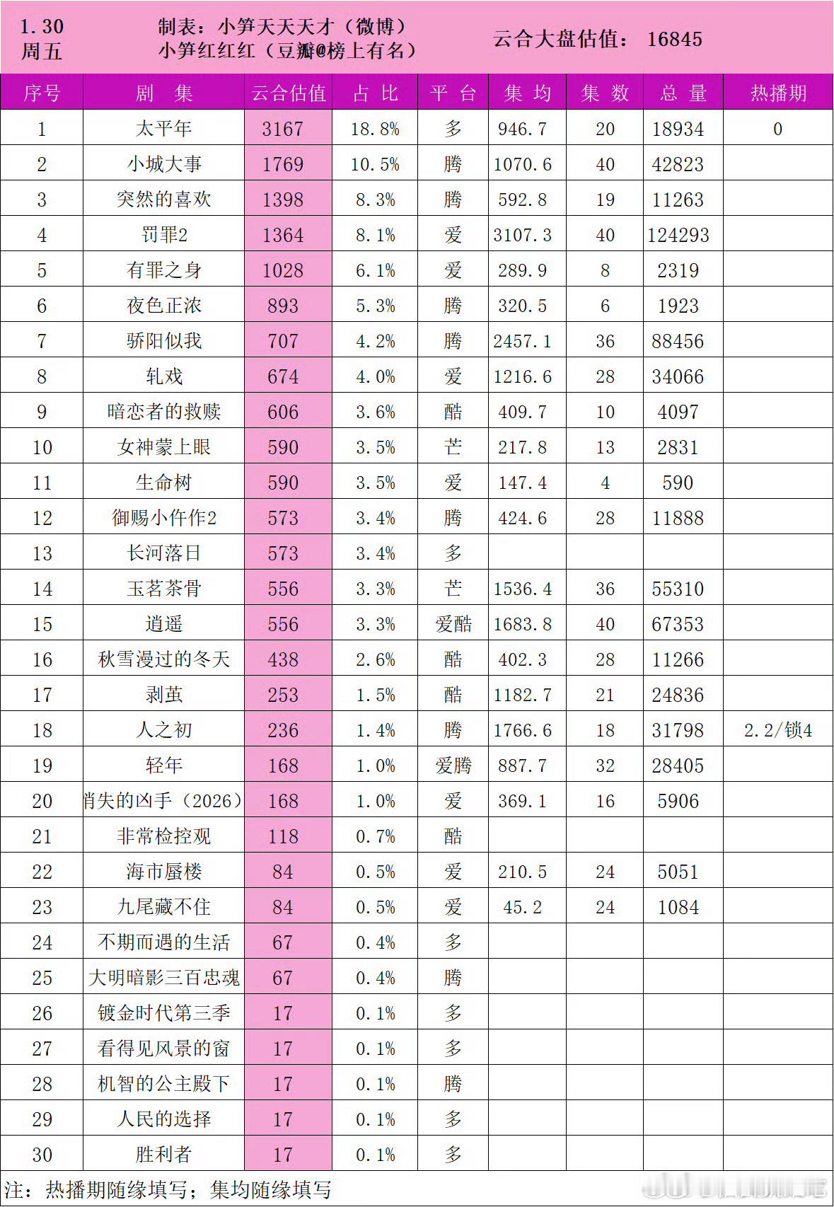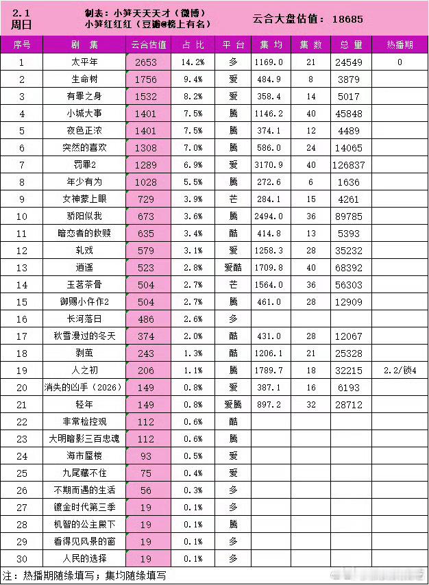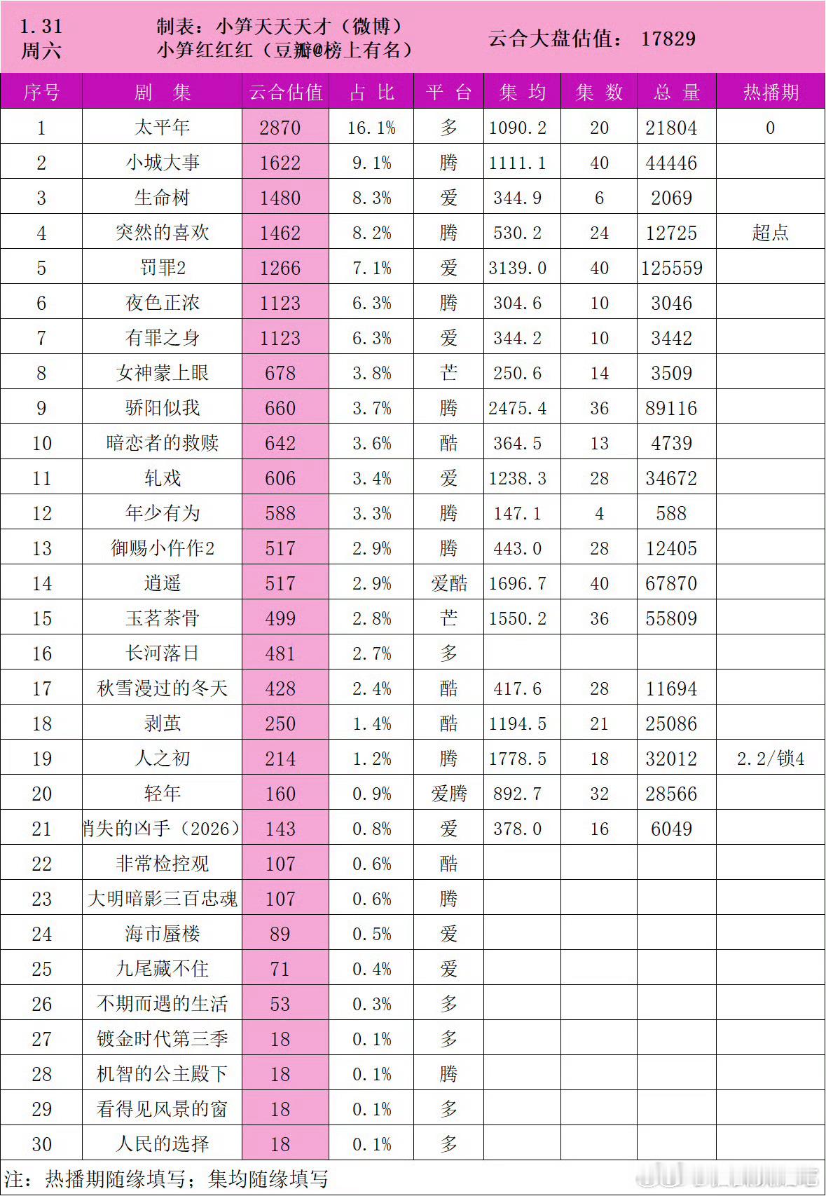 生命树的酷云,cvb收视率以及云合播放量完全对不起开播前的造势,可能有人对寒假央视收视率没概念,我放一张前段时间收视率被嘲的小城大事就能看出生命树有多扑了。