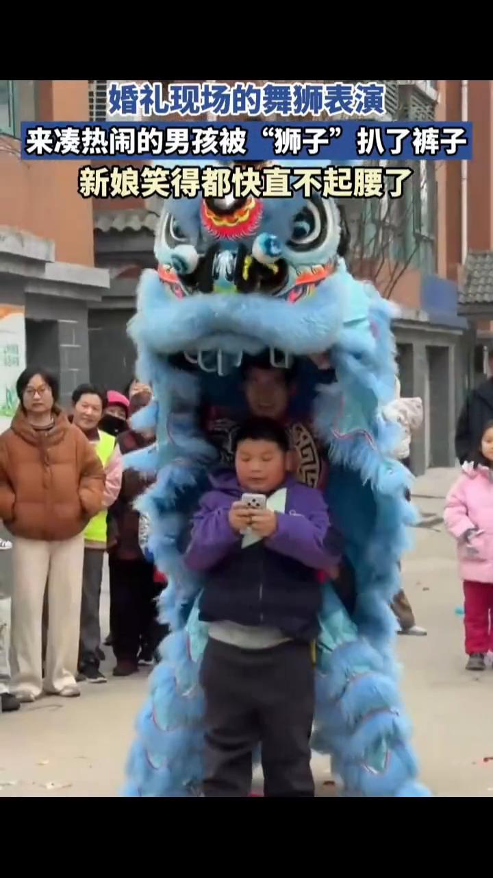 婚礼现场的舞狮表演,来凑热闹的男孩被"狮子"扒了裤子,新娘笑得都快直不起腰了。 2月2日(发布日期)。