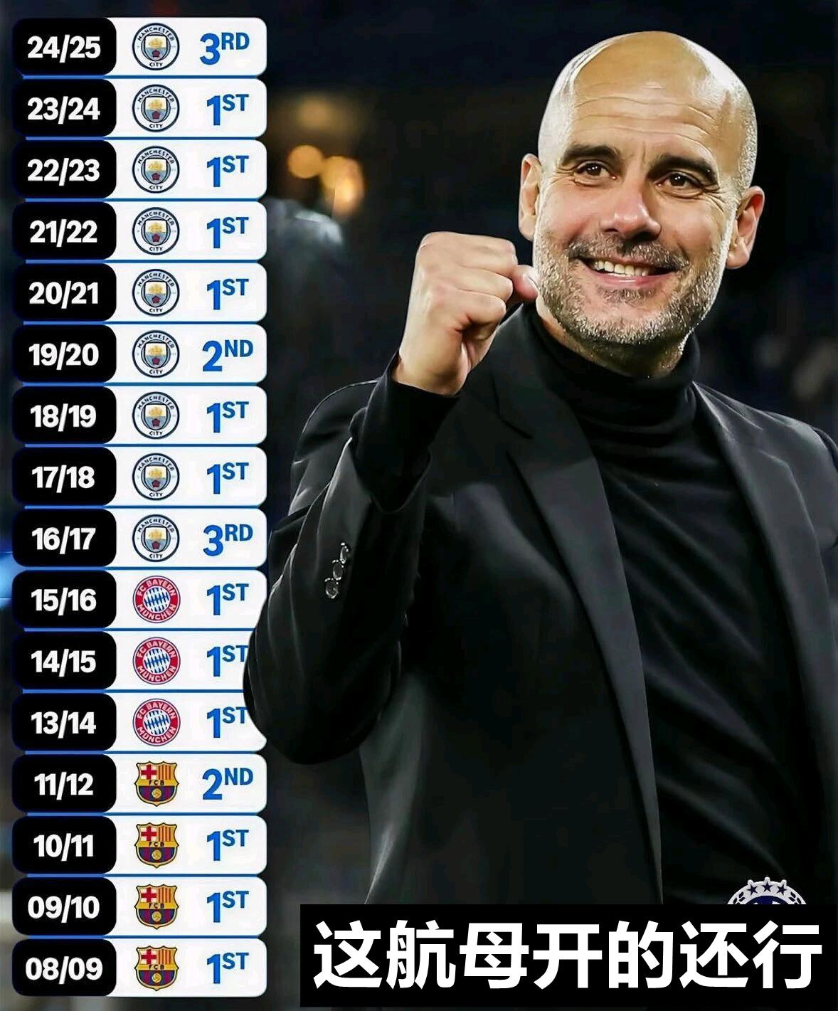 瓜迪奥拉执教历年联赛排名!常年稳居前三,历史罕见。[捂脸] 我记得08年瓜帅接手巴萨的时候,球队当时正走下坡路,后来瓜果断放弃小罗等梦二功臣,扶正梅西,才有了后面的梦三; 接手拜仁的时候,南大王一直是德甲霸主,不过瓜帅改变了拜仁的打法,欧冠真不尽如人意。 去曼城就不用说了,换个教练肯定拿不到英超六冠,英超竞争太激烈了,瓜帅到了联赛下半程几乎不犯错误,这给对手的压力太大了。 冷知识:瓜还没有连续两年丢掉过联赛冠军,按照历史规律今年应该第一的。不过现在最大可能要打破这个记录了。