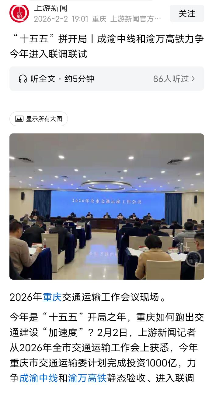 重庆至途经忠县至万州时速350公里的渝万高铁为2026年内力争开启静态验收和联调联试的项目,2027年可以如期开通运营,渝万高铁建成后重庆至万州将形成双高铁模式,重庆坐高铁来往忠县只需半小时左右,来往万州只需不到50分钟,相比走郑渝高铁垫江和梁平段可以节省20分钟,未来等渝西高铁和联络线建成开通后,丰都和忠县等地来往开州和城口还有西安等地也将非常便捷,目前渝万高铁全线正在全速铺设无砟轨道,忠县站综合交通枢纽和丰都北站已初具规模,三斗丘特大桥和涪陵长江大桥正在加速冲刺合龙。