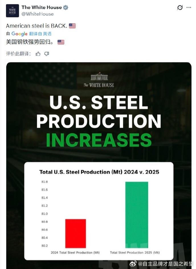白宫宣布美国钢铁强势回归一看纵坐标笑麻了车圈水军都不这么玩2025年美国钢铁产能昨天晚上直播正好看了美国全国是河北省的50%中国全国大概是美国的十倍多点。中国是全球的51%,第一工业巨兽汽车强国基础已经铸牢!