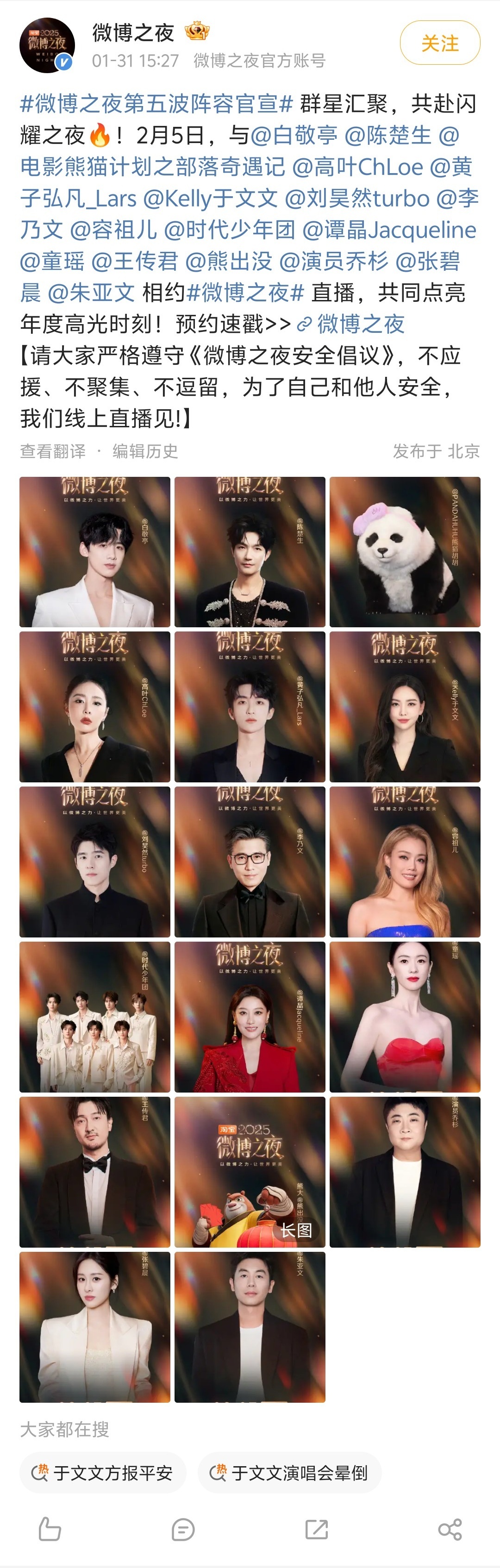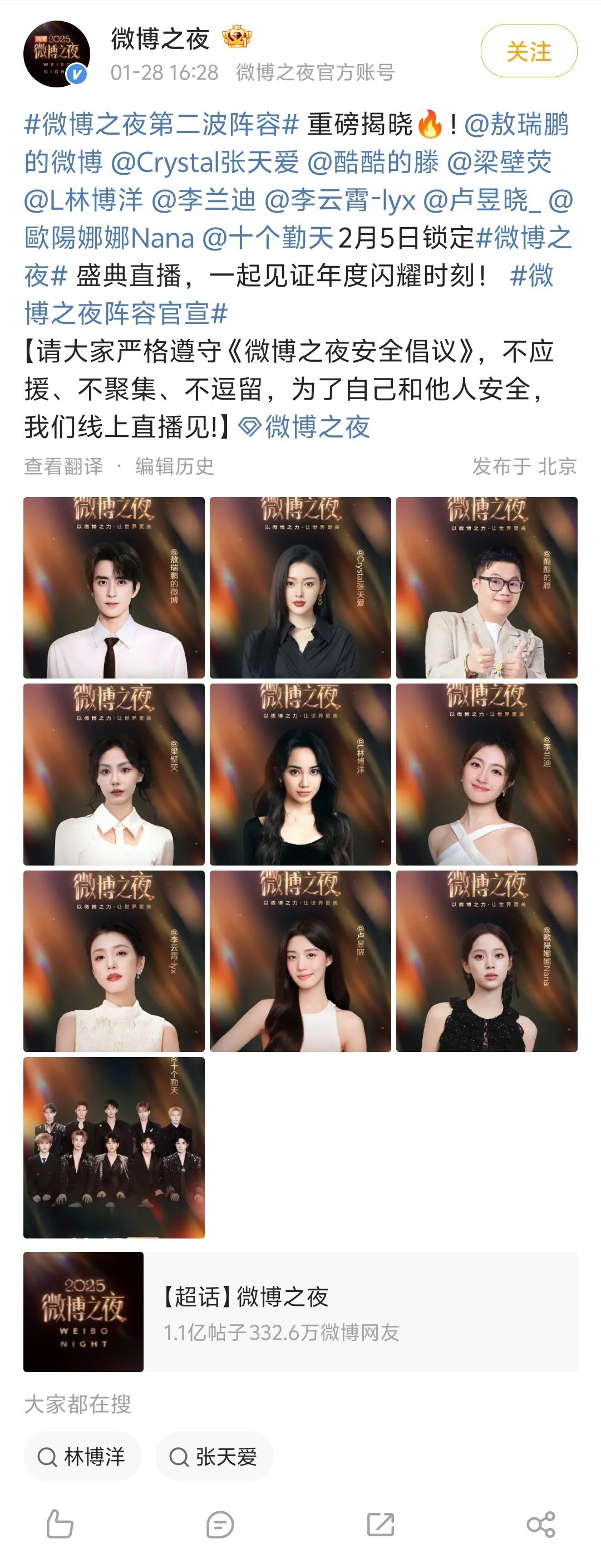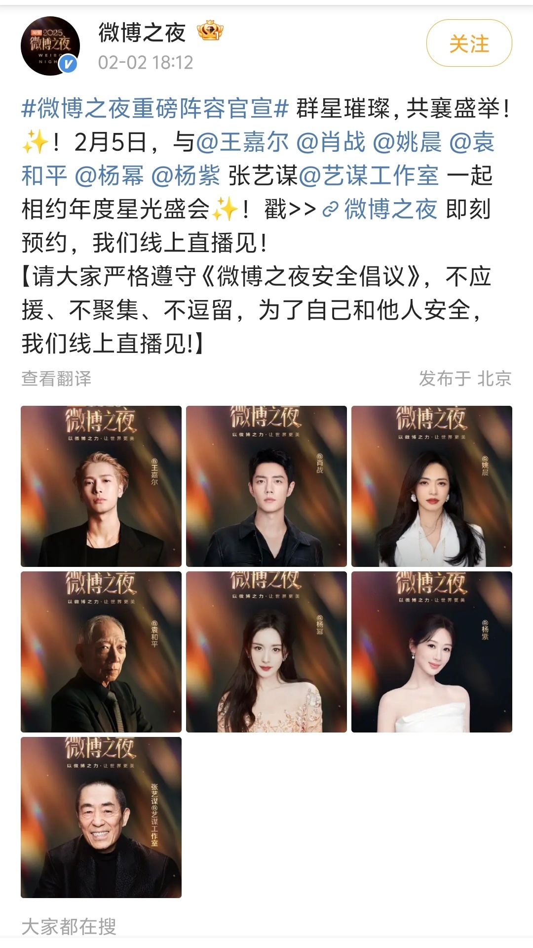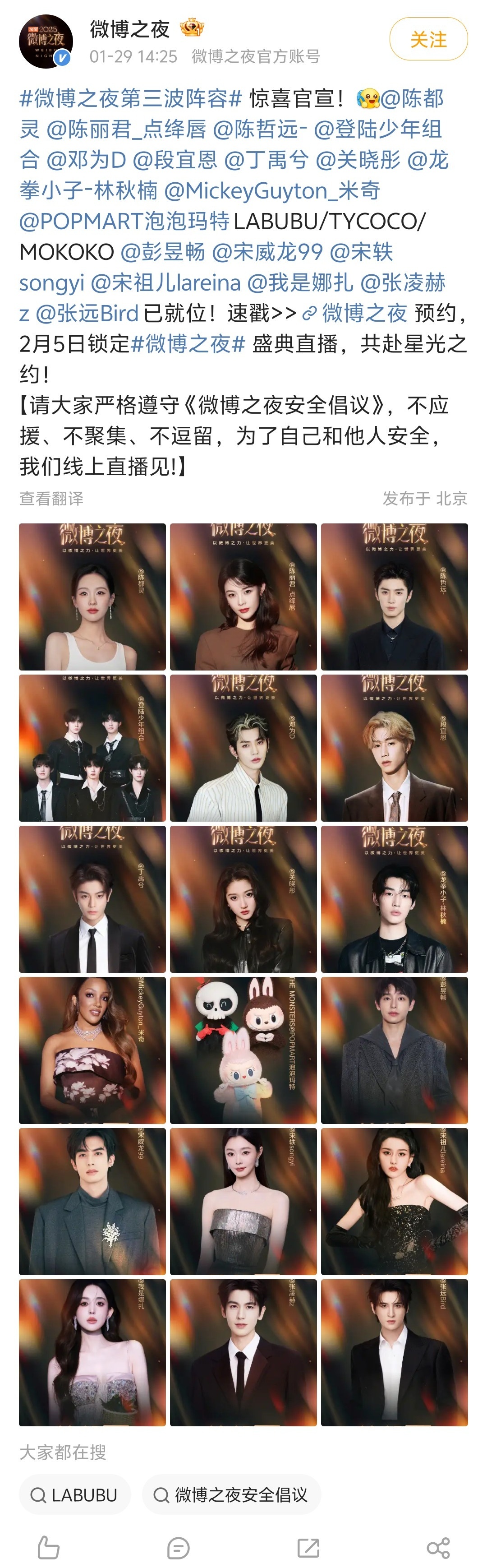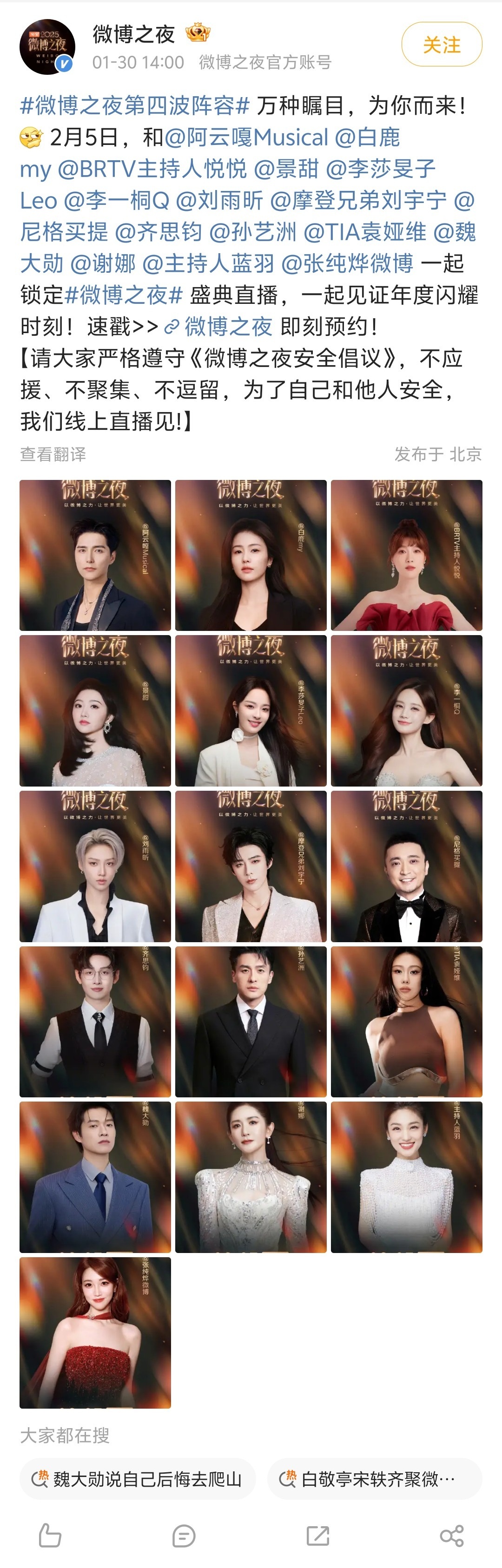 【微博之夜最想看的明星】微博之夜 2月2日,微博之夜星光阵容更新完毕!再来一起盘点一下确定出席的嘉宾们↓你最期待谁亮相?最期待哪些明星的梦幻联动?微博之夜最期待同框的明星