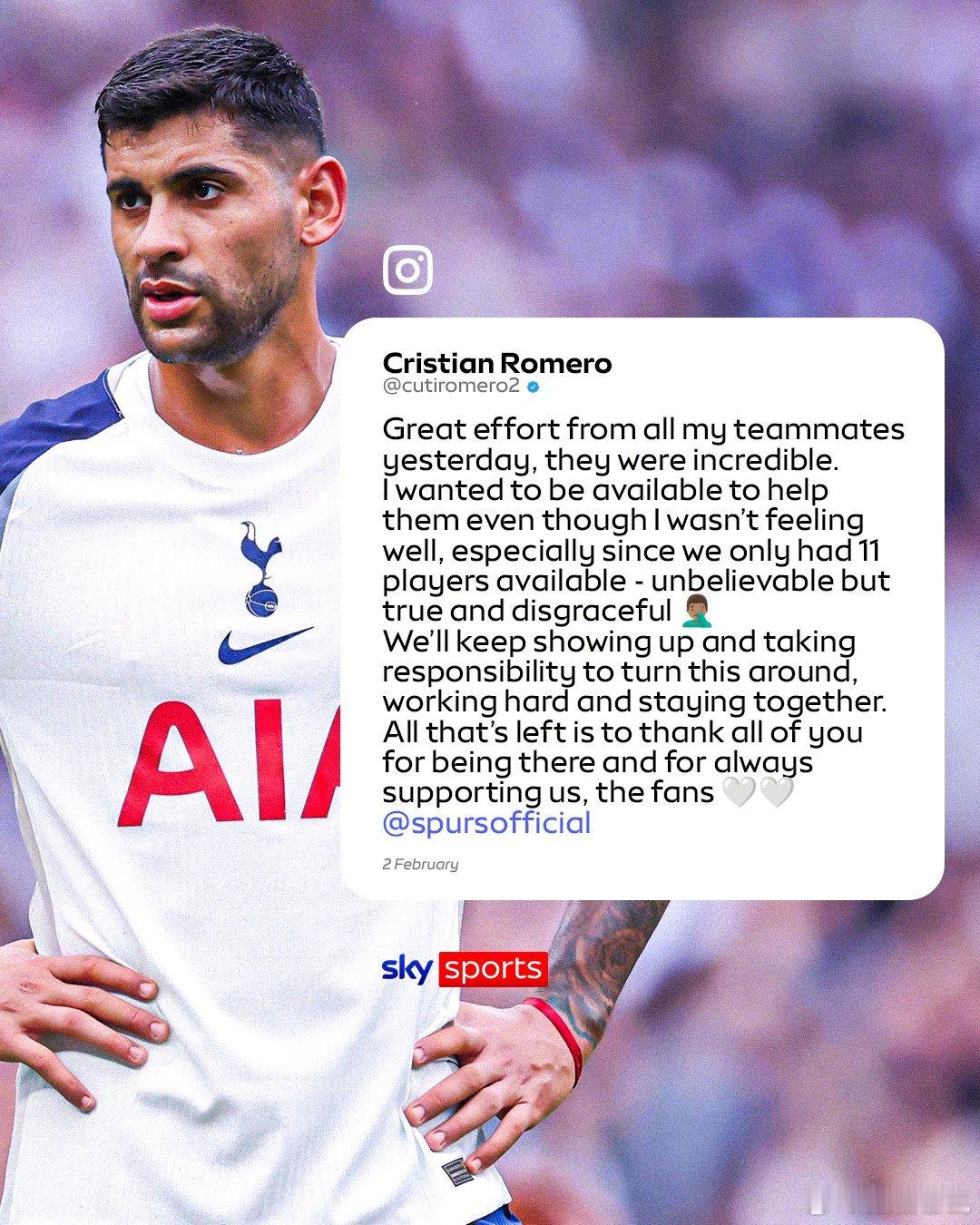 【队长开炮】热刺队长罗梅罗在对曼城的比赛中半场因为身体不适被换下,他在社交媒体上发文:“昨天全体队友都付出了巨大的努力,他们的表现令人难以置信。尽管我身体状况并不好,但我还是希望能够上场帮助球队,尤其是在我们只有11名球员可以出战的情况下——难以置信,却是事实,实在令人羞愧。我们会继续站出来、承担责任,努力扭转目前的局面,保持团队并刻苦工作。最后感谢那些始终到场支持我们的球迷。”英超