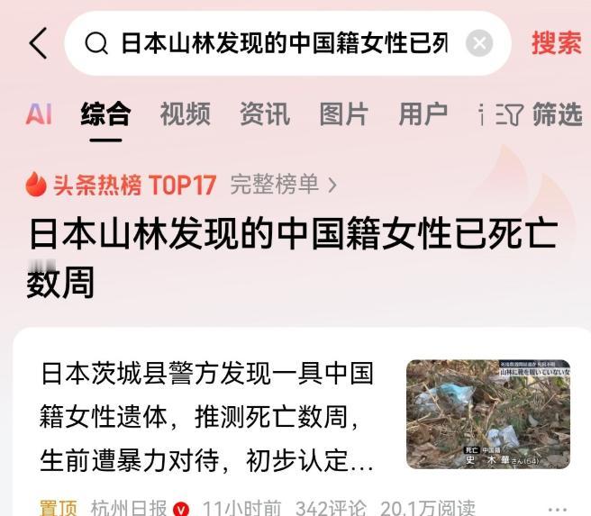 可怜啊!惨死异国他乡,更多消息流出来,这位被抛在山林中的女性尸体。是一名50多岁的中国女性,姓史。都说好言劝不住该死的鬼,这话说的也的确不错。 她是一个五十多岁的中国女人,姓史,被发现时孤身躺在日本山林里的某个角落,没有家人陪伴,没有可以说得上熟悉的面孔,甚至连一个体面离开的权利都没有。 死亡的方式太残忍、太无助、太沉重。 这样的年纪,是最会心疼人的年纪。 她可能是一位母亲,念着儿女生活的辛苦;可能是一位妻子,操持着家里家的几顿饭一箩事;也很可能,是为了照顾家人、临时打工而来到日本,想着多帮衬点家用。谁也想不到,这次出门,却走上了生命的尽头。 她的离世,比死亡本身更让人痛心的是——那种命悬异国却“无处可问、无处可依”的孤独感。 时至今日,她的更多信息还未公开。 对于远在国内的家属而言,既不知她遭遇了什么,也无法亲身赶赴现场,只能靠只言片语拼凑出冰冷真相。这种等待,比痛哭更折磨人。 她不是第一个,也不是唯一一个。就在最近,一起抢劫案在日本东京发生——中国游客遭催泪喷雾袭击,三箱高达4.2亿日元现金被抢;不仅如此,羽田机场也几乎同时发生另一起类似事件,作案手法惊人一致。 日本警方认定,两起事件背后极有可能是同一团伙,针对目标直指携带大量现金的中国人。 你说现在日本安不安全?怕就怕,有些人还觉得这是“小概率事件”。 可事实是,从治安,到天气,再到人身安全风险,都在不断堆高警戒线。在这一背景下,中国驻日大使馆已经多次提醒国人“非必要不前往”,甚至连航线都取消了几十条。 但你拦得住机票,却拦不住“心不听劝”的脚步。 很多五十岁上下的中老年出境者,语言不通,活动圈子局限,一旦出事根本无法求救。 手机里没有紧急联络人,脑中没有报警意识,被恶人盯上,那是连大声呼救都成了奢望。你能说她不警觉吗?你能责怪她一人出远门吗?其实他们只是不懂这个世界的恶意有多重,没有人告诉过他们,危险并不是电视新闻才会播出的情节。 他们从不过度小心,也不设防备,只是听说外面机会多一些,想去碰碰运气。 他们对世界的信任,是用一颗心换来的,却不知道这份心有可能被辜负得多惨。 除了人为风险,日本自然灾害也从未手软。 就在1月底,北海道一场突如其来的大雪导致大量航班取消、道路瘫痪,多人因灾身亡,还有游客被困机场,超市食物被抢光,一些人只能靠泡面勉强挨过几天。留在那的,不少是中国游客。 本可以舒舒坦坦地在家喝碗热汤的人,就因为一次旅行,落得连热水都喝不上。这不是夸张,是现实。 史大姐的死亡,让我们再次看见一个沉甸甸的事实:出国不只是“说走就走”,更不是“玩命去看风景”。 不是每场旅行都值得冒险,也不是所有旅游地都值得我们信任。 特别是如今这种外交紧张、舆论异常、自然灾害频发的时间段,去日本,太多不确定,太多安全漏洞,一个不慎,不仅是花冤枉钱,更可能付出生命代价。 平安,永远是旅行的底线。国家能做的都做了,从提醒、航司配合退票、调整航班,到事发后的领事协助,但再多的努力也无法替我们保护个人选择。一旦你选择“逆风出发”,就必须有承担风险的准备。 她的故事不仅令人痛惜,更应该带给我们警醒:再强的风景都比不上回家的票根,再多的欲望都比不过家人等你平安的心。 愿她走好,也愿我们从今天起走出去前,多问自己一句:真的安全么?值得吗? 你看到这件事有什么想说的吗?欢迎留下你的想法,我们一起把安全意识传出去。