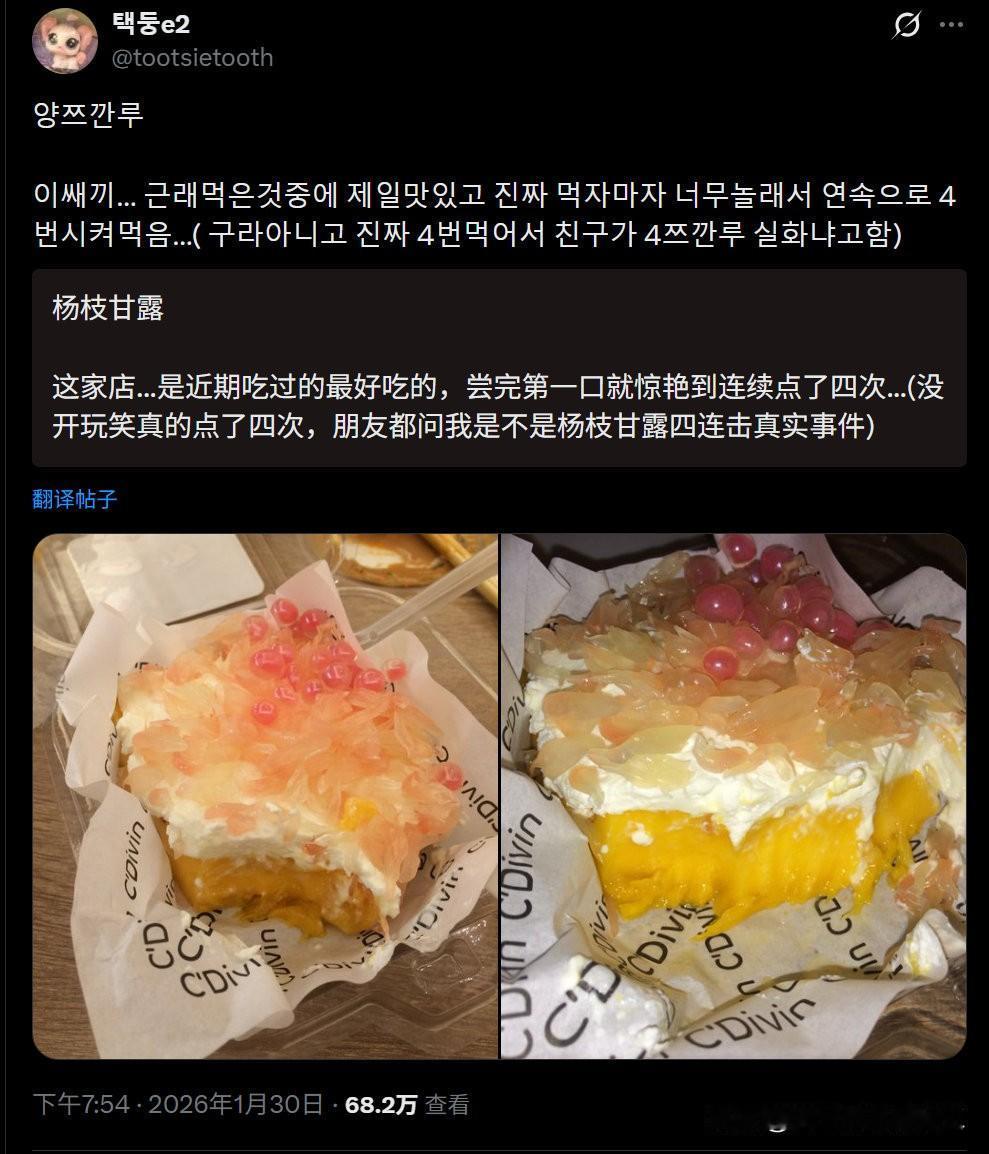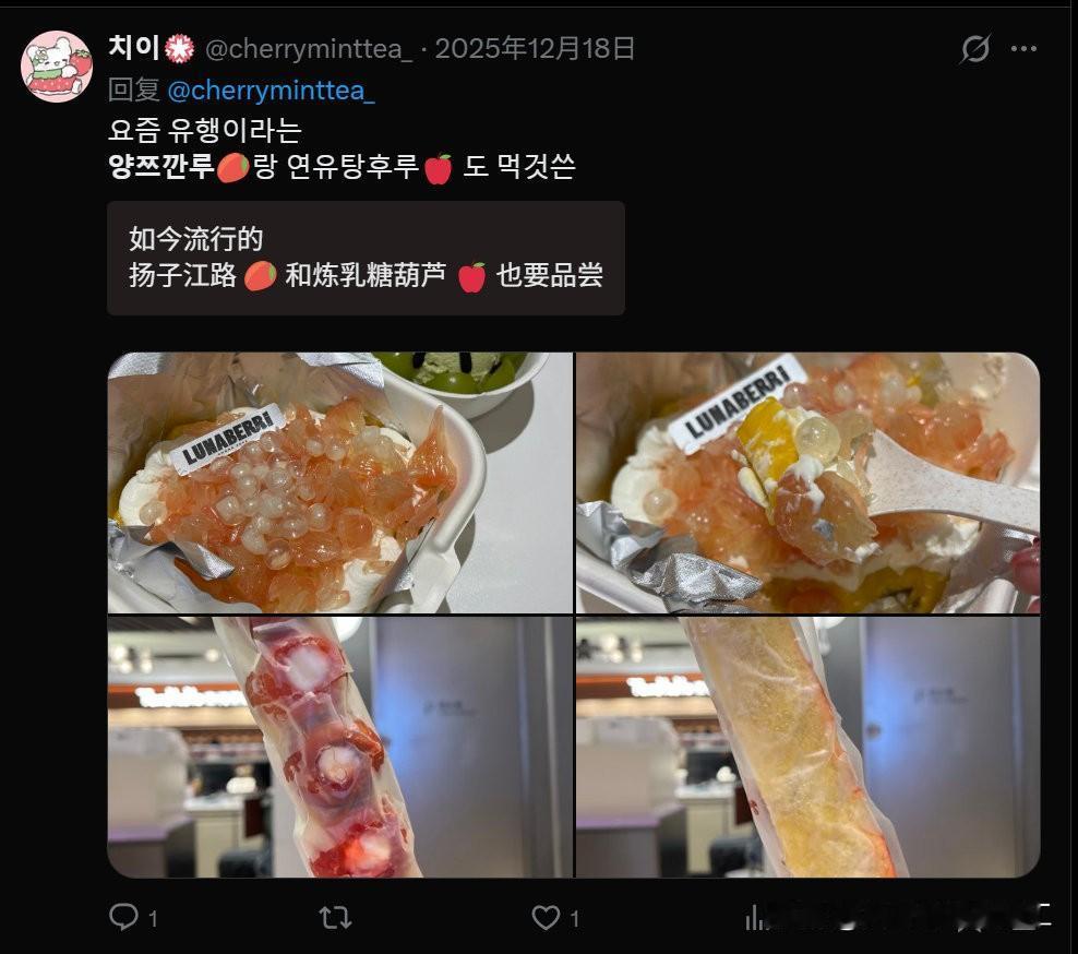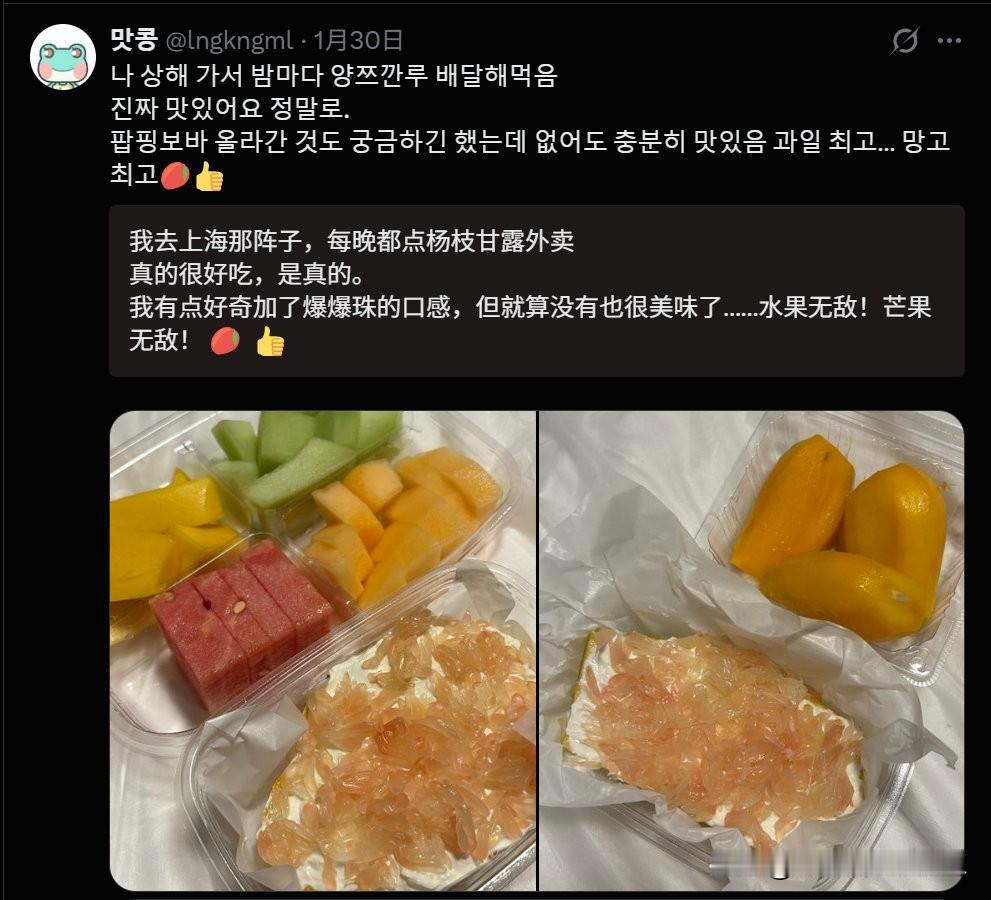 来中国旅游过的韩国人,正在网上疯狂安利“固体杨枝甘露”(양쯔깐루)。 主要韩国那边确实物资匮乏,出来旅游也舍得花钱,促进经济,蛮好!