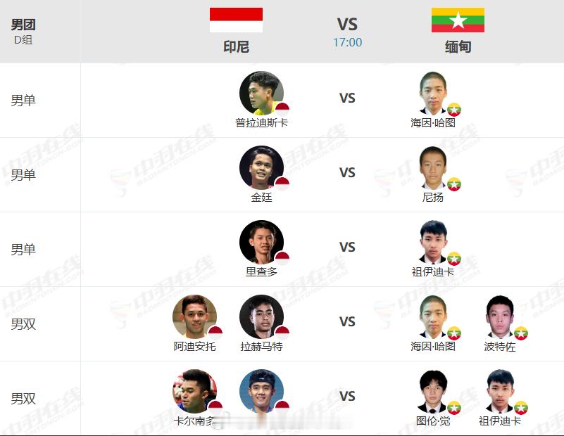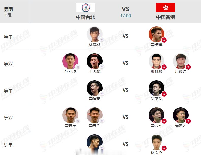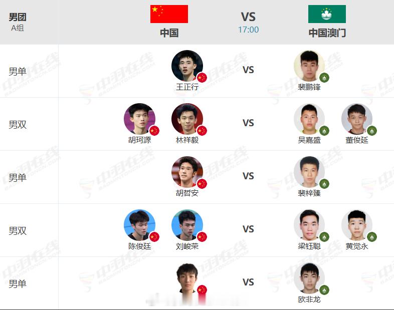 一单:王正行 vs 裴鹏锋一双:胡珂源/林祥毅 vs 吴嘉盛/董俊延二单:胡哲安 vs 裴梓臻二双:陈俊廷/刘峻荣 vs 梁钰聪/黄觉永三单:朱轩辰 vs 欧非龙