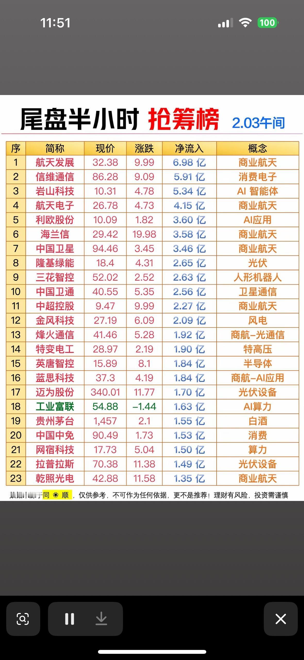 2月3日尾盘半小时抢筹榜 📈💰 揭秘热门股票,抓住财富机会! 尾盘抢筹热点:商业航天、AI、消费电子领涨,光伏、风电跟风,资金活跃但需谨慎。