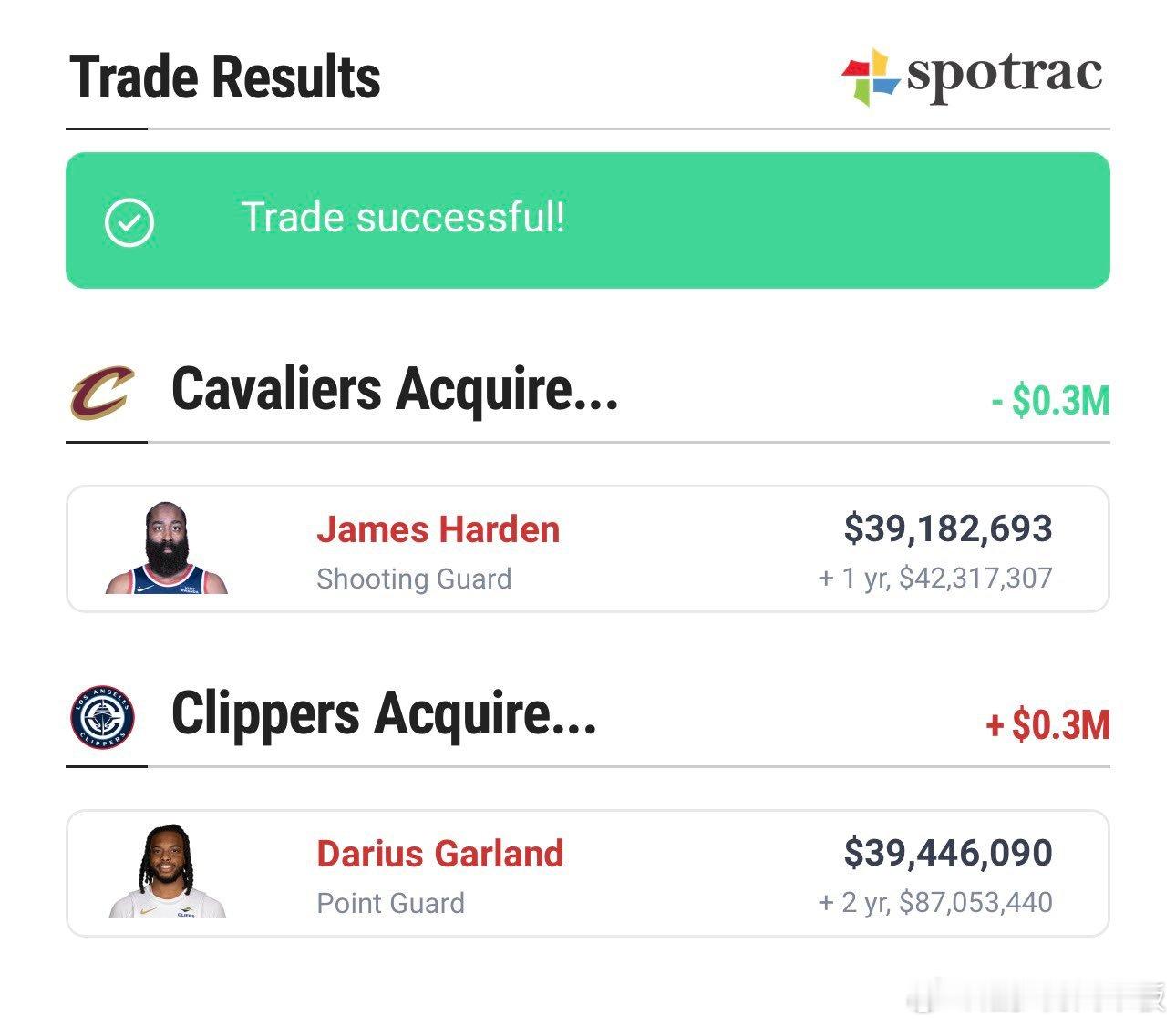 理论上,哈登的合同和加兰可以直接1对1配平