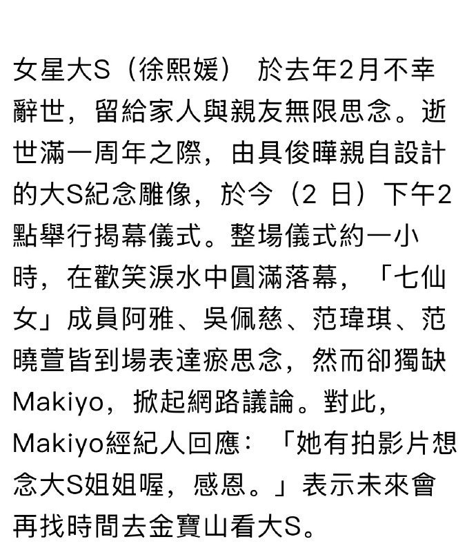 Makiyo回应缺席大s雕像揭幕大S雕像揭幕仪式“七仙女”独缺Makiyo引热议,她未正面说明缺席原因,经纪人代为回应:已拍影片寄托对大S姐姐的想念与感恩,未来会择期前往金宝山追思Makiyo经纪人回应缺席大s雕像揭幕大S雕像旁边是高以翔的雕像