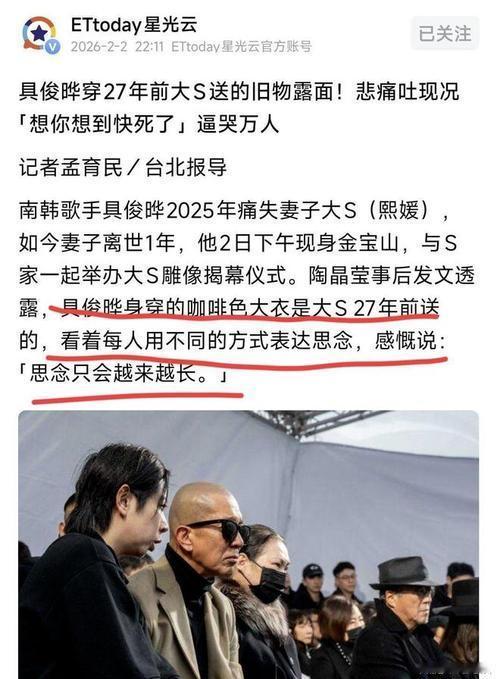 2月2日台北金宝山,具俊晔穿27年前大S送的咖色大衣现身其雕像揭幕仪式,大衣领口磨边、色泽泛白,袖口还有他亲手缝的补丁。这件1999年大S借剧组道具送的礼物,内衬绣着两人首字母,见证了他们的地下恋与重逢。他冒雨护衣,手写信里的字句,道尽跨越生死的长情。大s具俊晔 具俊晔