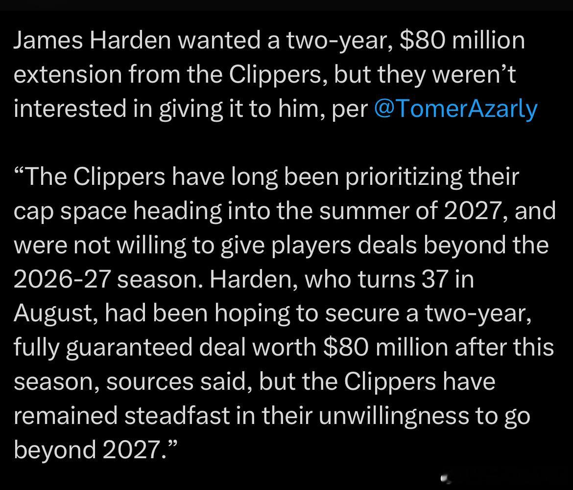 快船记者Tomer:哈登想要一份2年8000万的续约合同,但快船无意答应他的请求。