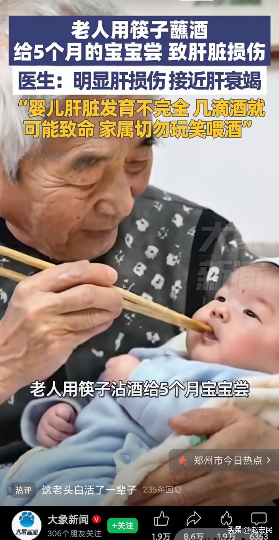 河南郑州一老人用筷子蘸酒给5个月宝宝喝,导致孩子几乎肝衰竭。 好像很多人都有这样的心态,从小就开始让孩子尝酒,美其名曰,锻炼酒量,真傻。 喝酒,在很多人的价值观里是必需品, 不喝酒就没有真感情, 不喝酒就是不给面子, 不喝酒就是偷奸耍滑, 不喝酒就是自私自利, 不喝酒就会寸步难行, 。。。。。。