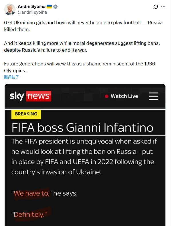 随后,乌克兰外长瑟比加在社媒回应道:“679名乌克兰的男孩、女孩永远不能再踢球了,他们被俄罗斯杀死了。尽管俄罗斯未能结束战争,但杀戮仍在继续,道德败坏之人却在建议解除对俄罗斯的禁令,后人会将这视为如同1936年奥运会一样的耻辱。”