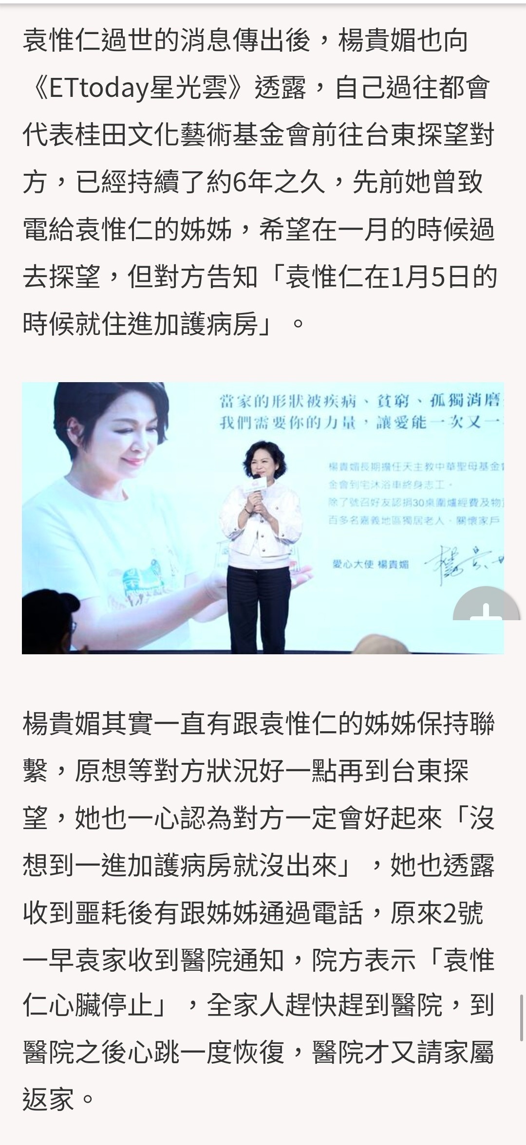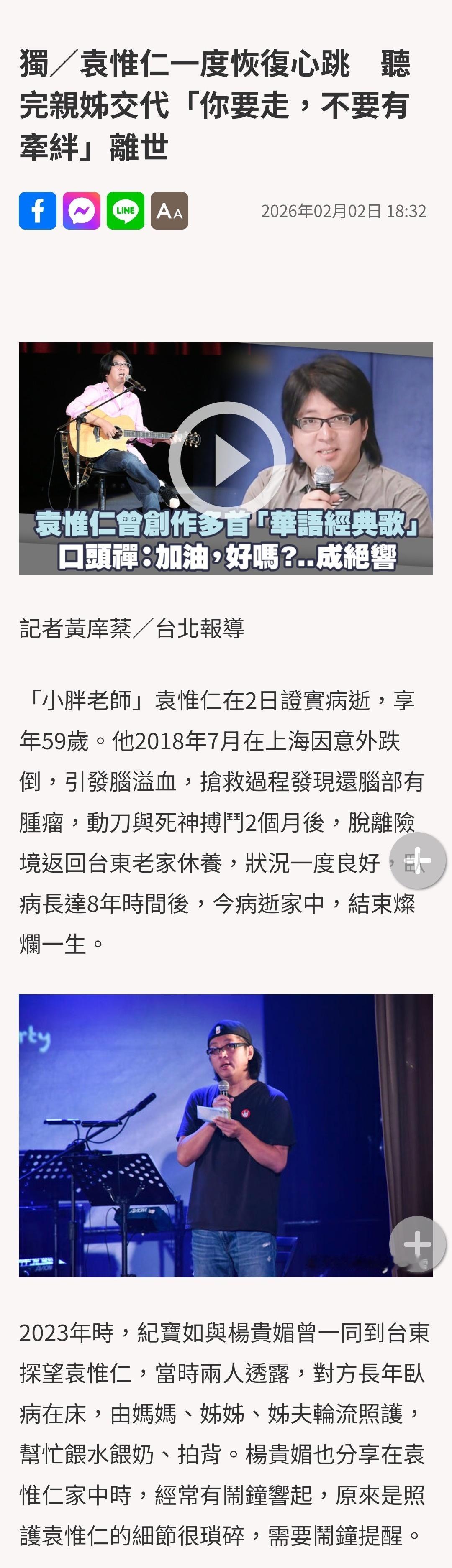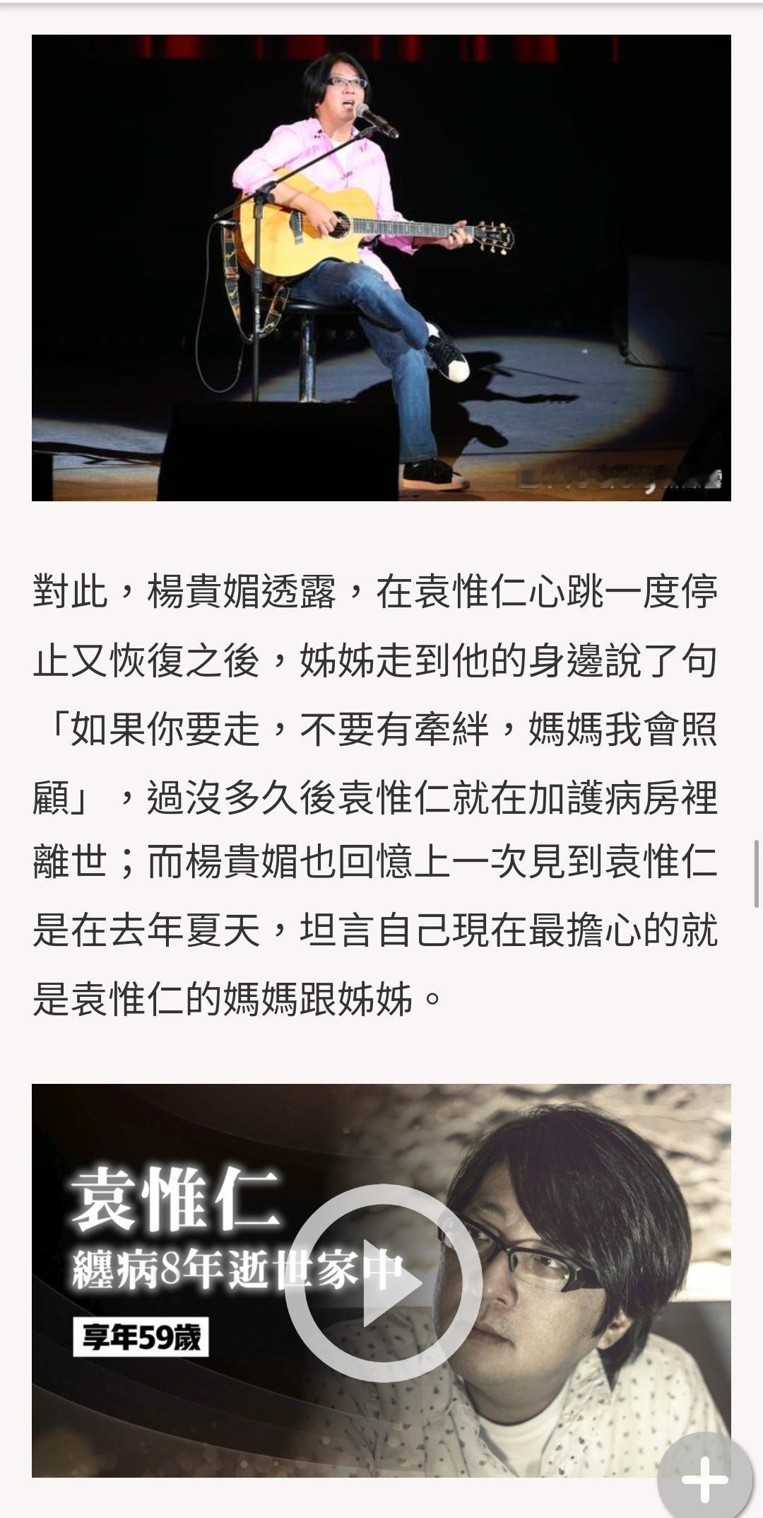 【袁惟仁去世当天心跳一度恢复】姐姐对袁惟仁说的最后一句话 2月2日,“小胖老师”袁惟仁病逝。2018年,袁惟仁在上海因意外跌倒,头部受伤引发脑溢血中风,抢救过程中被查出脑部有肿瘤,清醒后回台东老家疗养。然而2020年袁惟仁再度发生摔倒意外,紧急送医抢救后仍意识不清,被医生判定为无意识状态的植物人,此后一直卧床。友人透露,2月2日一早,袁家收到医院通知,院方表示“袁惟仁心脏停止”,全家人赶快赶到医院,之后袁惟仁心跳一度恢复,医院才又请家属返回家中。姐姐走到他的身边说了句“如果你要走,不要有牵绊,妈妈我会照顾”,没过多久,袁惟仁在加护病房里离世。(ETtoday星光云)