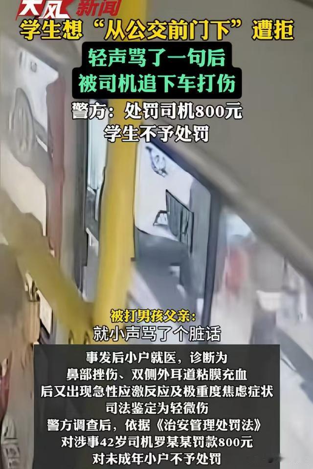 甘肃白银,16岁男生坐公交车,到站后想从前门下车,司机不给开门,男生小声骂了他一句,司机听到大怒,追下车打了他一巴掌。男生家长要求司机赔偿,公交公司回应,司机已经被罚款800元,如果男生家长再不依不饶的,他们就追究男生的责任! 据、大风新闻等报道,16岁的小户是会宁县的一名学生,事情发生于1月11日中午11点多钟,小户放学的路上。 当天中午,小户放学后乘坐9路公交回家吃饭,到站后,小户走到前门位置,让司机开一下门。 小户问了第一次,司机没吭声,小户又问了一遍,司机还是没吭声,直到第三遍,他才没好气地说了一句:后门不能下吗? 这趟公交平时人比较多,一般遇到人多的时候,司机都会打开前门,让大家前后门一块下车。小户从前门下习惯了,可这天车上人不多,司机就没开前门。 原本这是一件很小的事,可错就错在司机态度不好,小户又多了句嘴,他从后门下车时,轻声嘟囔了一句“敲你麻”。 《治安管理处罚法》规定,公然侮辱他人的,处五日以下拘留或者五百元以下罚款;情节较重的,处五日以上十日以下拘留,可以并处五百元以下罚款。 但小户是个16岁的未成年人,虽然骂了司机,但只是轻声嘟囔,没达到公然侮辱的程度。 《治安管理处罚法》还规定,已满十四周岁不满十八周岁的人违反治安管理处罚法的,从轻或者减轻处罚。 小户骂人肯定是不对的,但他的违法情节轻微,达不到拘留的程度,顶多只会被批评教育一番。 按理说,车上比较嘈杂,小户嘀咕一句也就罢了,可他这句话声音不大不小,司机恰好耳朵又比较灵,听了个清清楚楚。 如果司机大度一点,后面的事也就不会发生了,可那天司机不知道是有什么烦心事,竟然被小户这句话瞬间点燃了怒火。 他迅速解开安全带,打开旁边的防护栏,又打开前门冲了出去,小户还没走出两步,他就追了上去,拉住小户问:你刚骂什么?再骂一遍! 小户还是个孩子,顿时被吓住了,司机推搡了他一下,又朝他头上打了一巴掌。 幸亏站台旁边有人,路人赶紧走过去拉住司机,劝他:怎么能和一个孩子动手呢? 司机停手后返回驾驶室,事情从发生到结束前后不到一分钟。 小户回家后告诉了家属,小户的父亲立即报了警,3个小时后又带着小户做了个检查,检查结果显示,小户鼻部挫伤,双侧外耳道粘膜轻度充血。 8天后,小户又被检查出急性应激反应、极重度焦虑症状,而且经鉴定,还构成了轻微伤。 根据《治安管理处罚法》规定,殴打他人的,或者故意伤害他人身体的,处五日以上十日以下拘留,并处二百元以上五百元以下罚款;情节较轻的,处五日以下拘留或者五百元以下罚款。 司机罗某某听到小户骂人后,追下车推搡并打了小户一巴掌,导致小户受了轻微伤,后来还被查出急性应激反应、极重度焦虑症状。 民警认为,司机罗某某殴打小户不对,对他被处以了800元罚款。 但是小户辱骂司机也确属不当,念在小户是未成年人,又是初次违反治安管理,不执行行政拘留处罚,只对小户进行了批评教育。 处理结果出来后,可小户的父亲还是没消气,要求公交公司给个说法,还要让他们赔偿医疗费、精神损害赔偿金等损失。 公交公司出来回应称,罗某某打小户是他的个人行为,和公交公司无关,至于小户家长的索赔要求,如果他们还不依不饶,他们也要追究小户辱骂司机的责任! 那么,小户的父亲要求公交公司赔偿医疗费、精神损害赔偿金等损失,是否有法律依据呢? 虽然公交公司称司机打人是个人行为,但司机是在执行公交运营的工作任务。 根据《民法典》第一千一百九十一条,用人单位的工作人员因执行工作任务造成他人损害的,由用人单位承担侵权责任。用人单位承担侵权责任后,可以向有故意或者重大过失的工作人员追偿。 罗某某在驾驶公交车过程中,因小户言语问题下车打人,这和他的工作场景相关联,公交公司不能以个人行为为由逃避责任。 所以,小户父亲要求赔偿是合理合法的,公交公司应该积极承担起相应的赔偿责任。 这件事原本是件非常小的事,如果司机最开始态度好一点,小户也许就不会嘟囔那一句,如果小户不嘟囔那一句,也就不会挨打,司机也不会被罚款。 这件小事说明,人与人之间交往,退一步海阔天空!