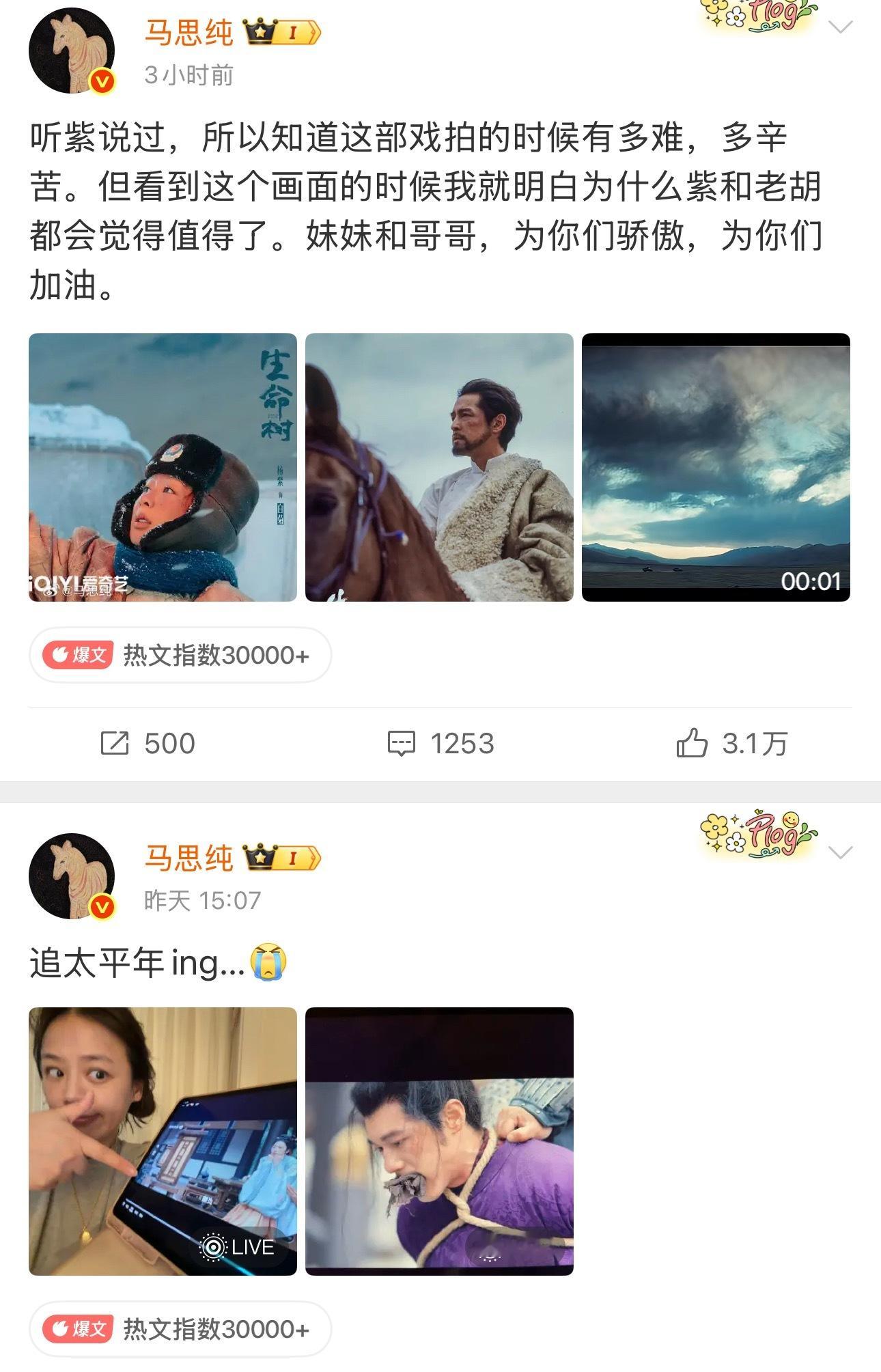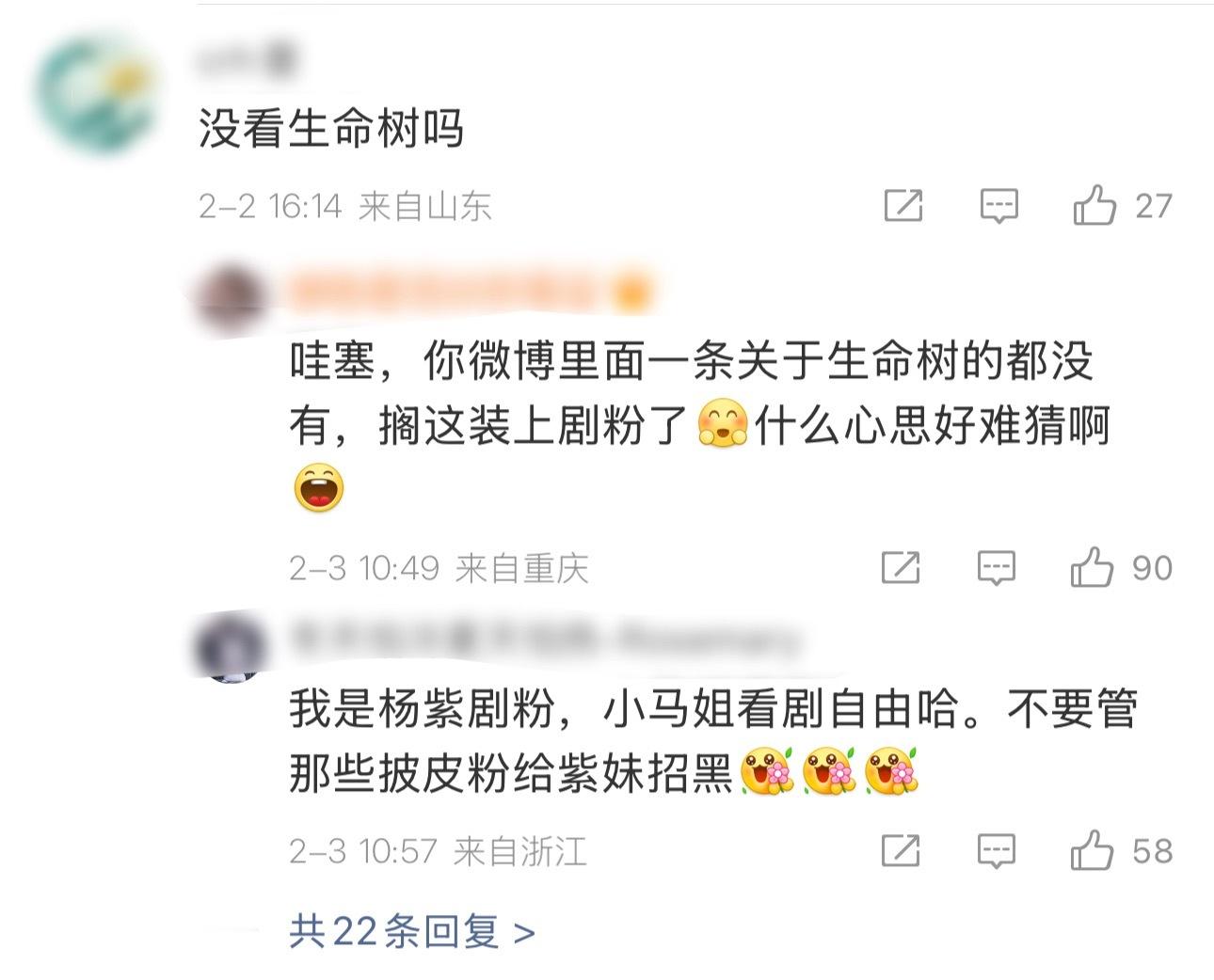 杨紫感谢马思纯hhh前一天发在追太平年被评论区审判了今天也发了生命树,所以评论区那些是pph吗 也没有这么催着别人看剧的吧