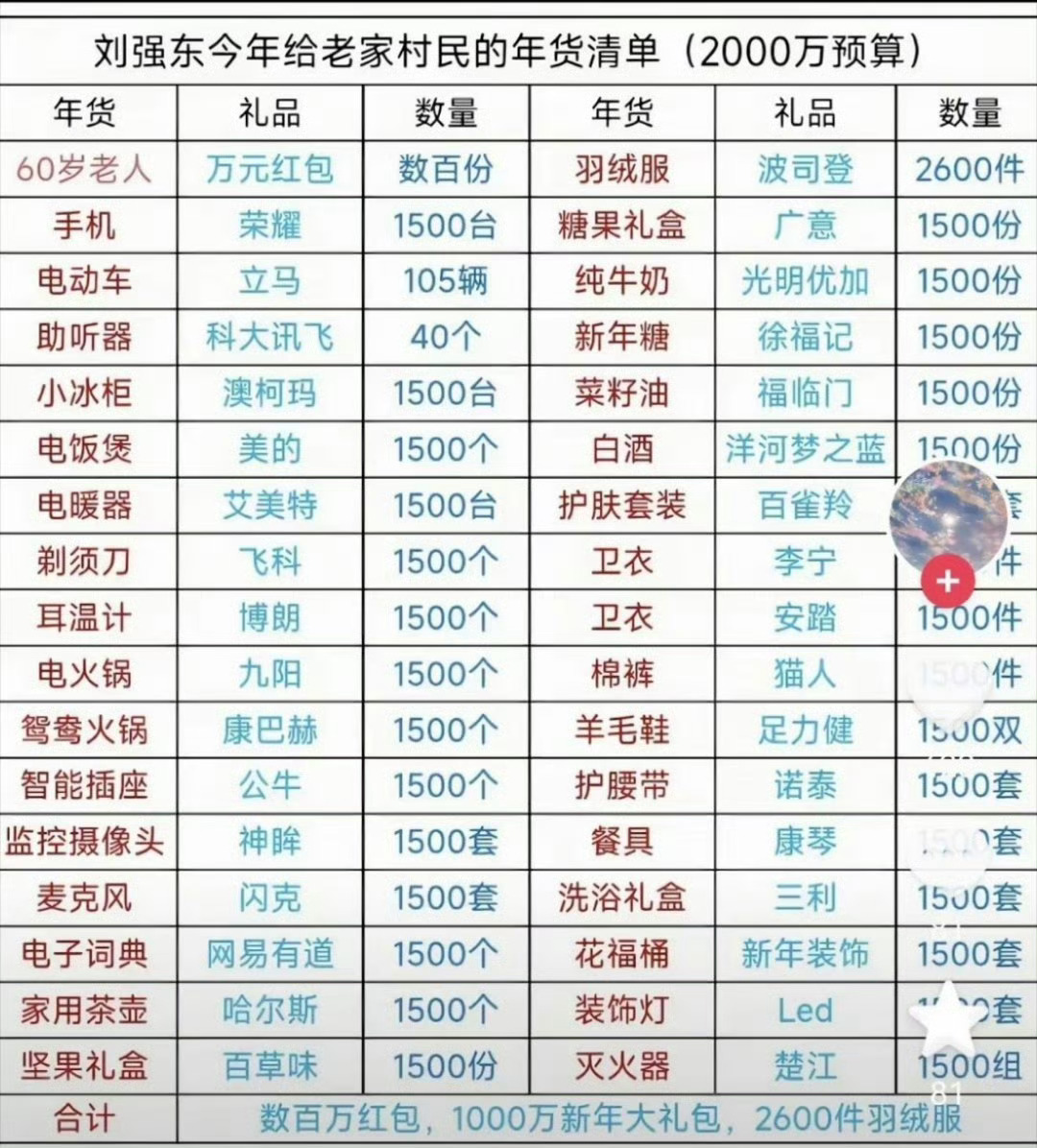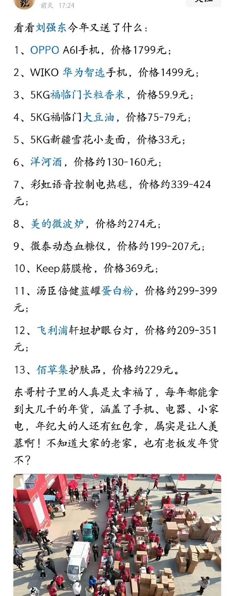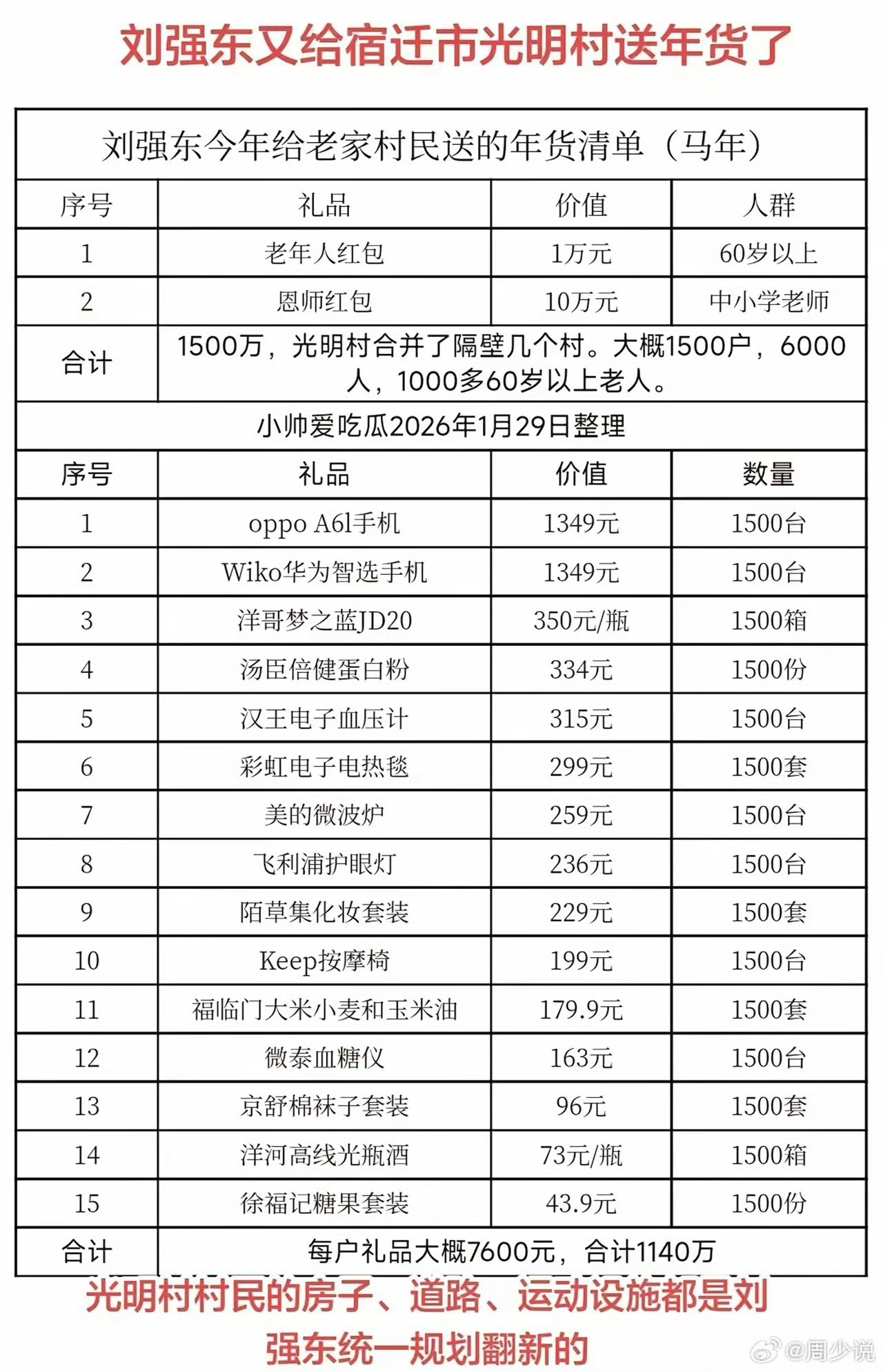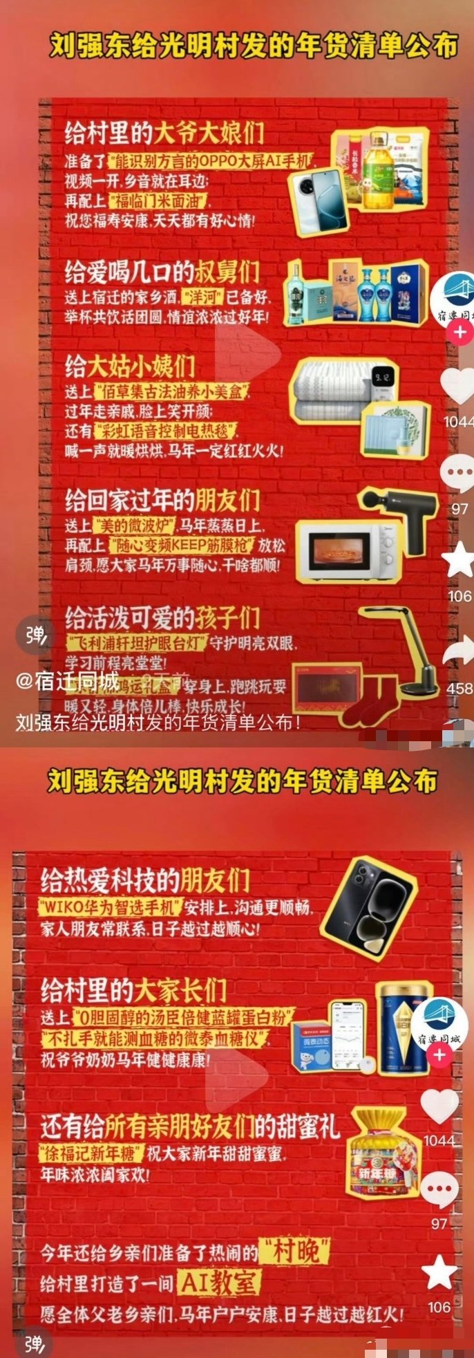 刘强东给宿迁光明村乡亲们发的年货清单,我在网上搜集整理了好几位网友的图,有的不太一样,但无论哪一个清单,都能反映出刘强东给乡亲们发年货,不是随便发的,而是很走心盯着乡亲们的需求发的,能最大程度的提高年货的利用率。或者还有一个维度,看看这些东西送的是否精准,就是去一些二手电商平台上,看看有没有大量转卖的。#京东#