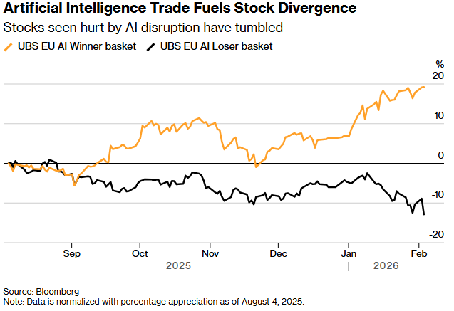 此次股价下跌正值被认为易受AI冲击的公司普遍受挫之际。瑞银集团的一篮子“欧洲AI风险股”周二一度下跌4.7%,创下历史新低。