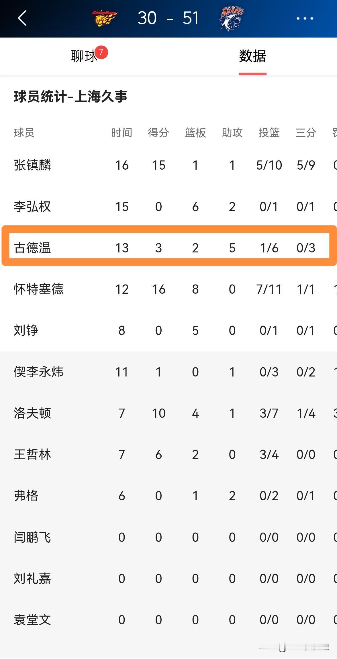 上海久事外援古德温真是太懂事了!在今天上海久事客场挑战广东东阳光的比赛中,目前双方半场战罢,上海久事以51:30领先对手。在前两节比赛中,古德温深知广东东阳光缺兵少将,因此古德温一反常态打出了非常低效的进攻表现。 在上半场比赛中,古德温首发出战13分钟,投篮6中1,其中三分球3中0、罚球2中1非常低效的得到3分,还有2次失误和2次犯规。 实事求是的说,如果不是因为古德温非常懂事,我相信上海久事在上半场比赛结束时已经领先广东东阳光30分以上了。