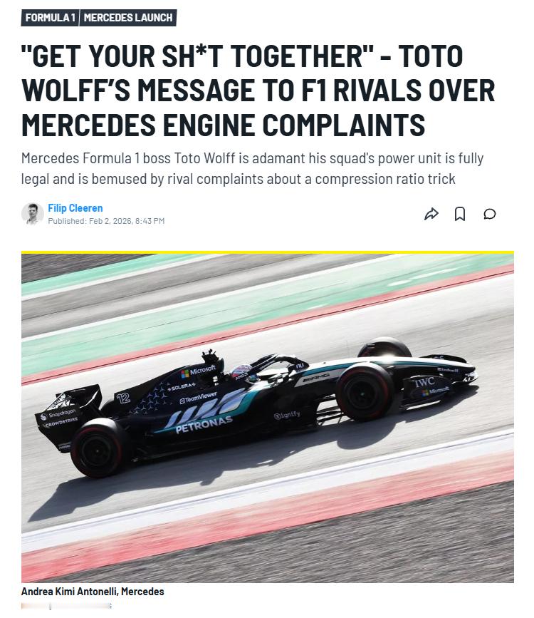 沃尔夫:“我只是不明白为什么有些车队把更多精力放在别人身上,并不断争论一个非常清晰透明的问题。我们与 FIA 的沟通一直非常积极,不仅是在压缩比方面,在其他方面也是如此。”