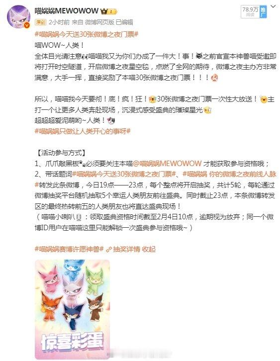 喵娲娲 微博之夜送票永动机 别的猫都在撒娇,只有喵娲娲在当送票永动机🚀!快加关注带话题喵娲娲再送30张微博之夜门票、喵娲娲 你的微博之夜前线人脉 转发,门票说不定就来了,速冲!