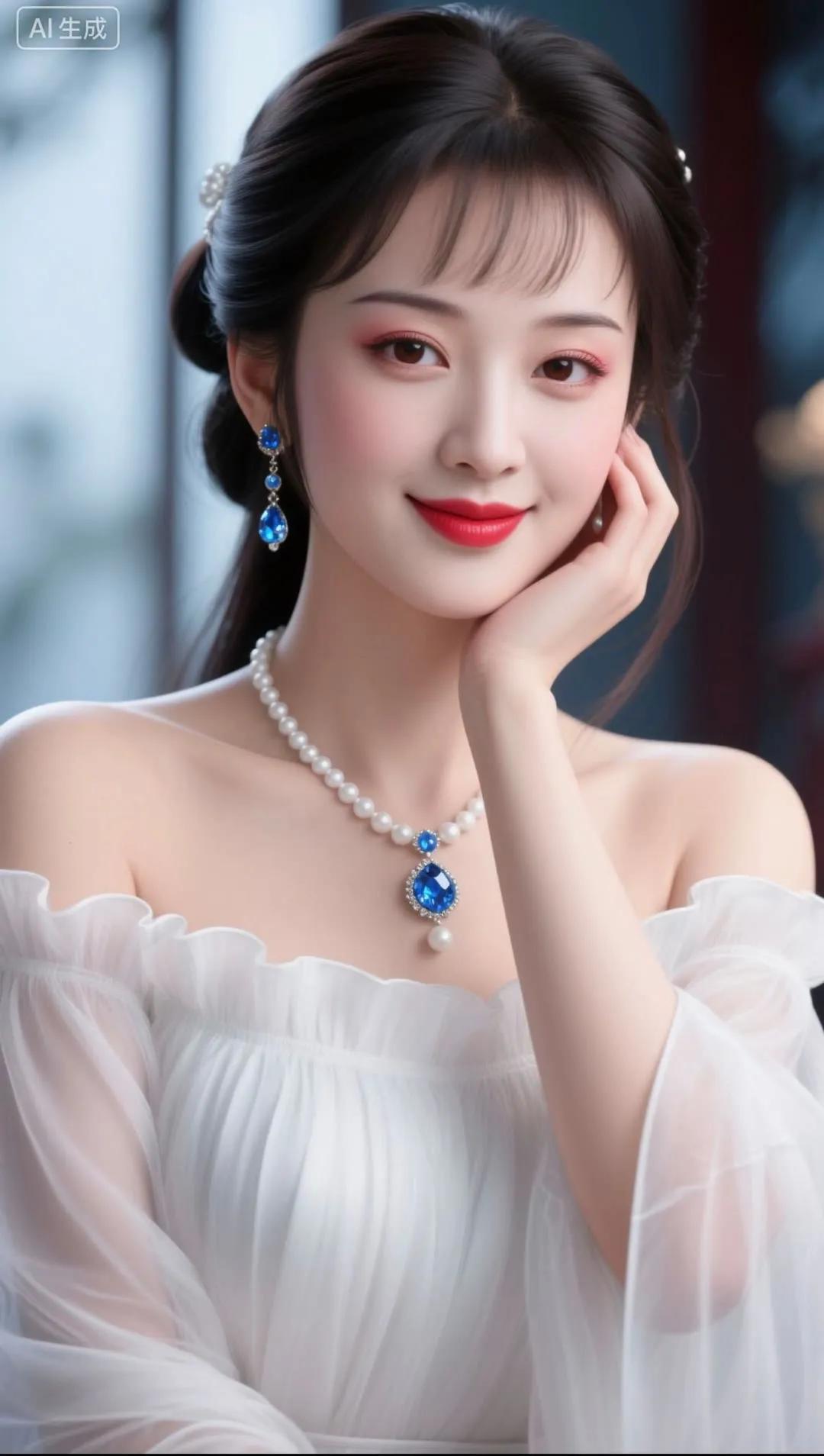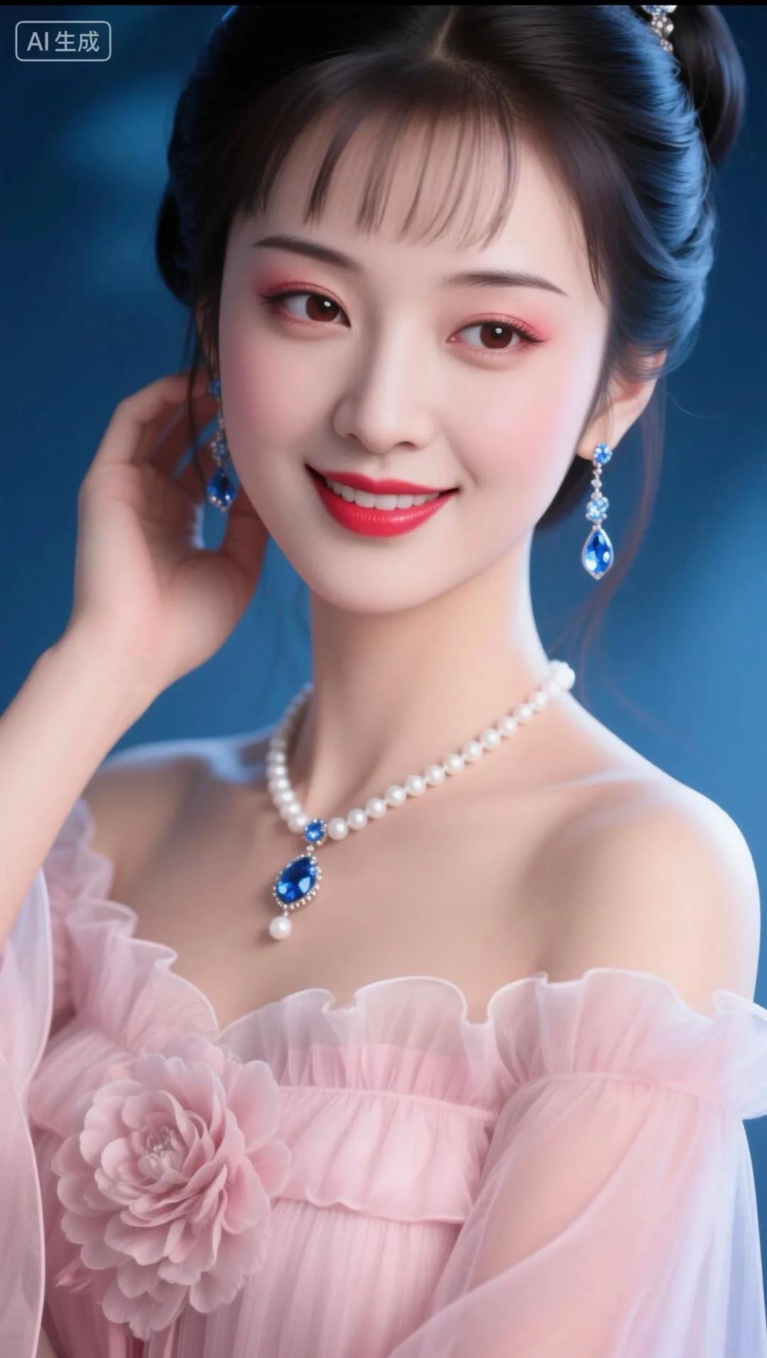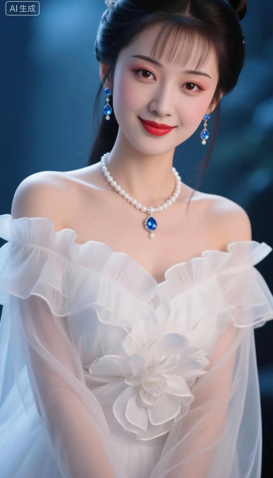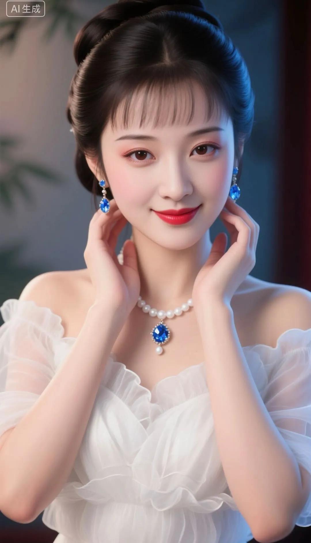 优雅红唇,蓝裙飘逸,闪耀的珠宝,完美女神!💄✨👗💎