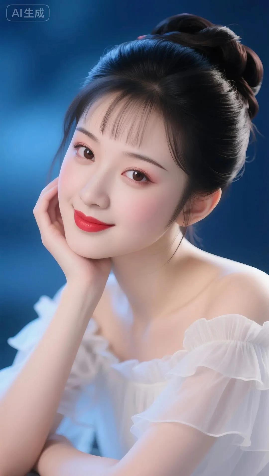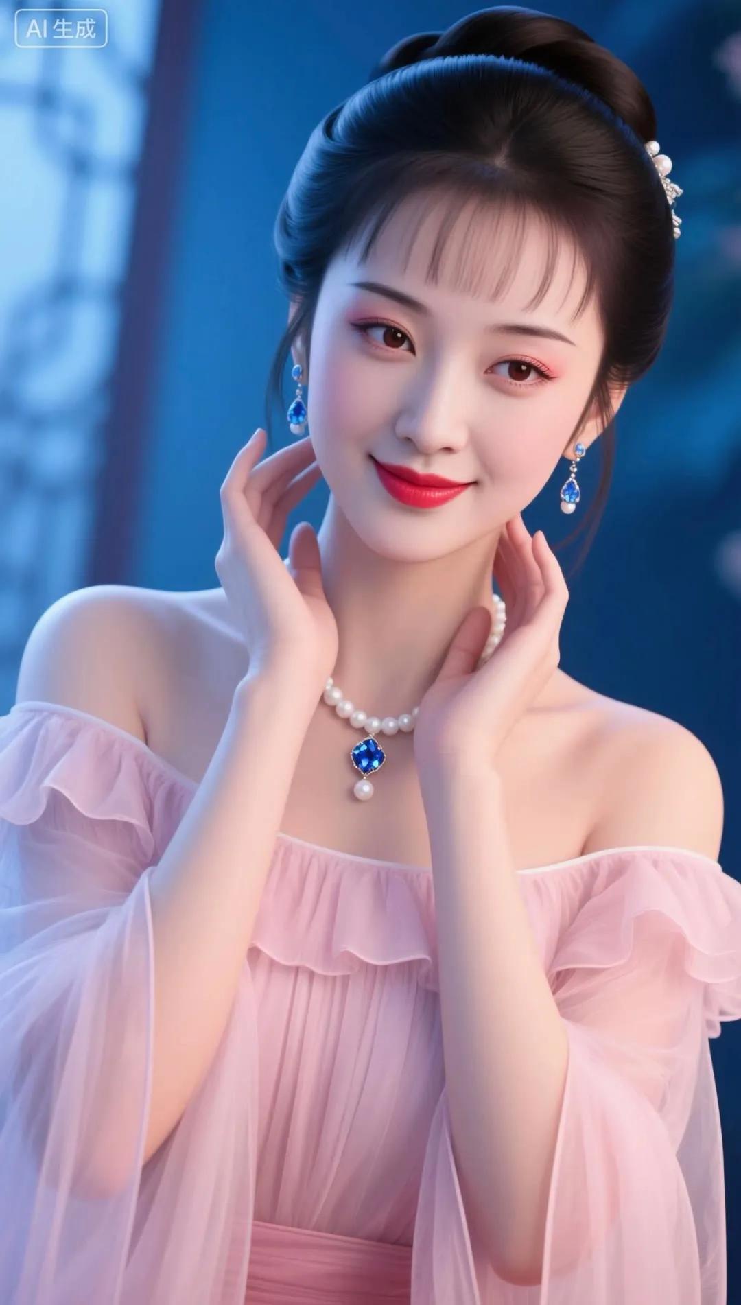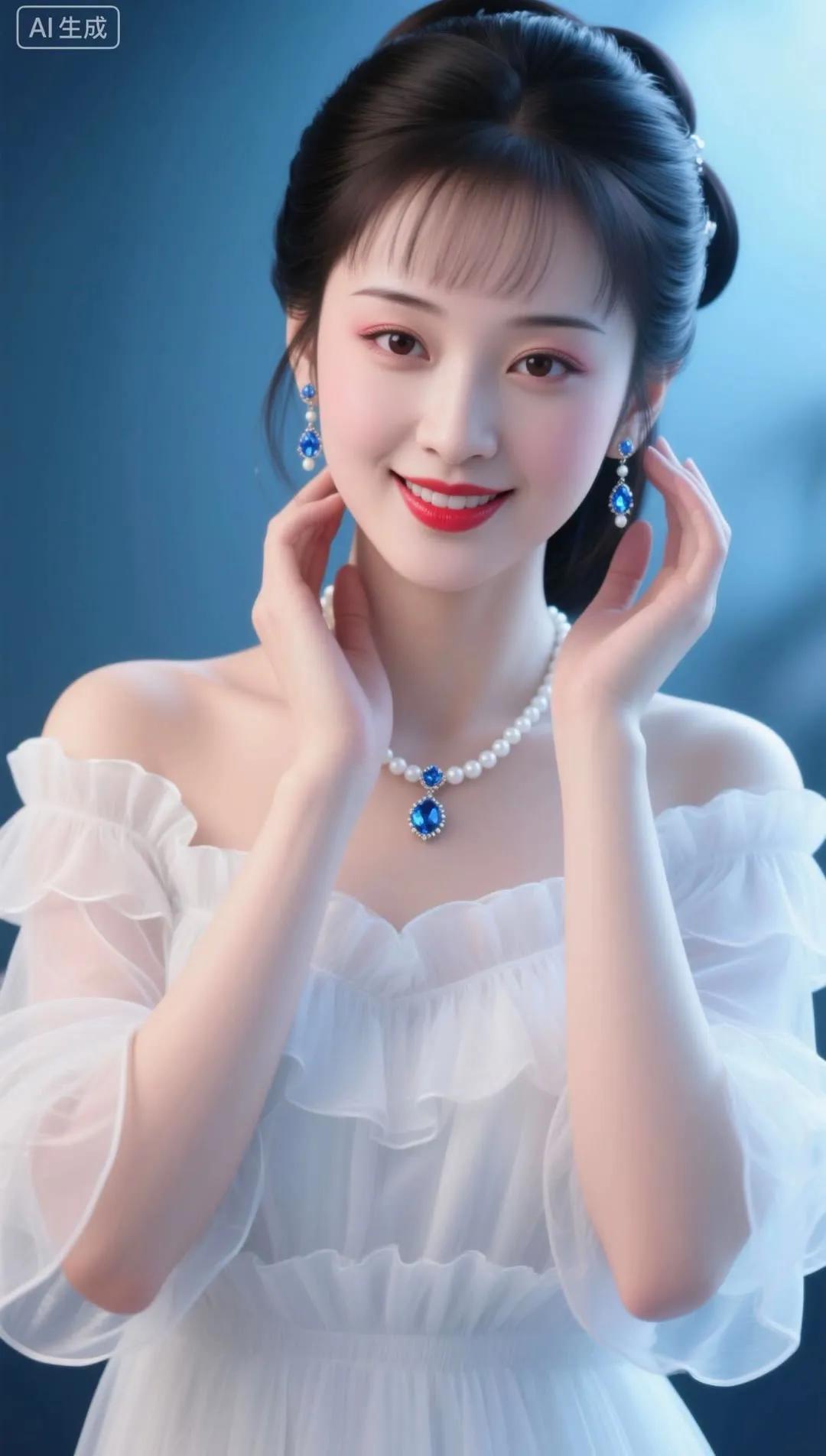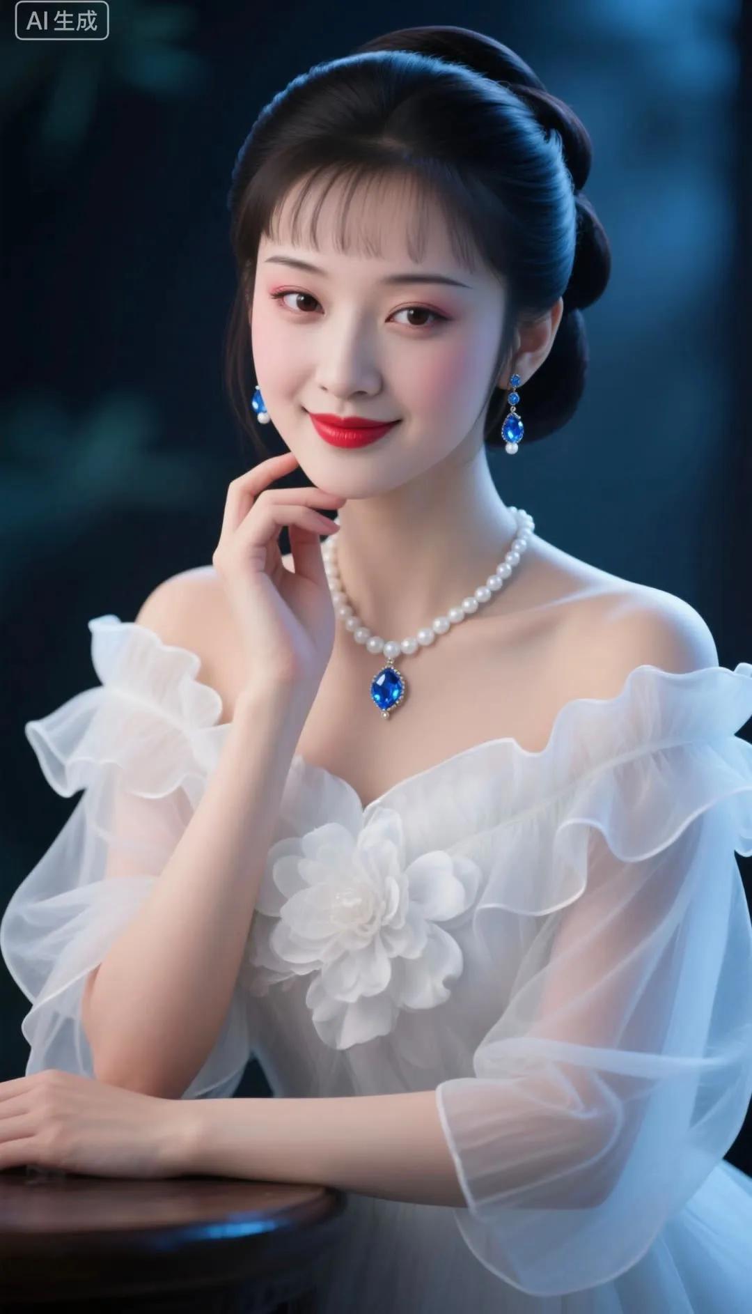 优雅红唇,蓝裙飘逸,闪耀的珠宝,完美女神!💄✨👗💎