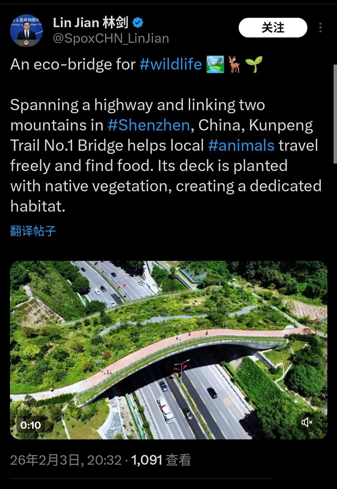林剑点赞深圳生态 2月3日,外交部发言人林剑在海外社交平台X个人账号发帖点赞深圳鲲鹏径一号桥,向全球网友展示深圳人与自然和谐共生的美好景象。林剑点赞深圳鲲鹏径生态廊桥 林剑在帖文中写道:“鲲鹏径一号桥横跨公路,连接中国深圳境内两座山脉,为当地动物自由活动和觅食提供了便利。桥面上还铺设有本土植被,形成一个专门的栖息地。” 2024年初,深圳鲲鹏径一号桥建成开放。这座桥横跨梅观公路、连接东西走向的银湖山和梅林山。桥上供人走动的步道仅占桥面的十分之一,其余的地方都修成山林模样,尽量接近自然山体形态,让野生动物可以通过这座桥,实现“两山串门”。 这座桥很快获得豹猫、野猪等动物的认可,红外相机数百次记录下它们悠然穿行的身影。 2025年底,深圳市山海连城鲲鹏径二号桥、三号桥建成开放。这两座生态廊桥的建成修复了深圳市玉平大道宝岗立交等交通设施切割出的生态断点。 一方面,鲲鹏径生态廊桥上设置了爬藤架与围护网,既能为行人遮挡阳光,又能作为生态隔离带,清晰划分人与动物的通行边界 另一方面,生态廊桥把动物的家园重新连接起来,为野生动物建立一条安全畅通的穿越走廊。这不仅让动物们能安心“串门”“自由恋爱”,更在车流不息的公路上为它们撑起一把保护伞,为它们的“城市生活”遮风挡雨。此外,覆土种植区仿照原生植被培育的几十种植物也为小动物提供了喜爱的“口粮”。 对此,网友纷纷评论:“城市发展好,不只是在经济上”“我在廊桥上看见了松鼠、蜥蜴……它们都不怕人”“好温暖的城市啊!”