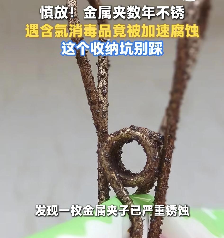 湖北荆州一位网友在整理储藏盒里的消杀用品时,发现一个金属夹子腐蚀得锈迹斑斑,而且锈迹都是很规律的,网友说这个夹子用了很多年,放在别的地方,一直都没有生锈,直到放到密闭的消杀用品盒里的时候就被腐熟了,他提醒大家平时收纳的时候,千万不要把一些金属饰品与寒露的消毒用品放在一起,以免被腐蚀。