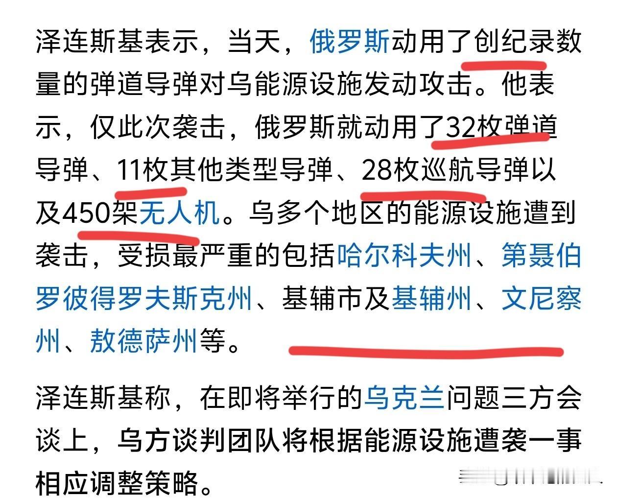 快讯!快讯! 乌克兰可能撑不住了?就在刚刚,泽连斯基突然转变态度,他说要调整谈判策略。 为啥要调整谈判策略呢?你看看图二就知道了。俄罗斯动用了这么多导弹,对乌克兰能源设施进行了打击,损失可能不小,为此,泽连斯基生气了,不高兴了。 至于他说要调整谈判策略,也不知道是什么策略。那我就在想,这两天美国费尽心思协调俄乌冲突,媒体不是报道三方要坐下来一起谈吗?难道又竹篮子打水一场空了吗? 当然了,不得不提欧洲,好像现在欧洲对乌克兰也没什么动静了呢。