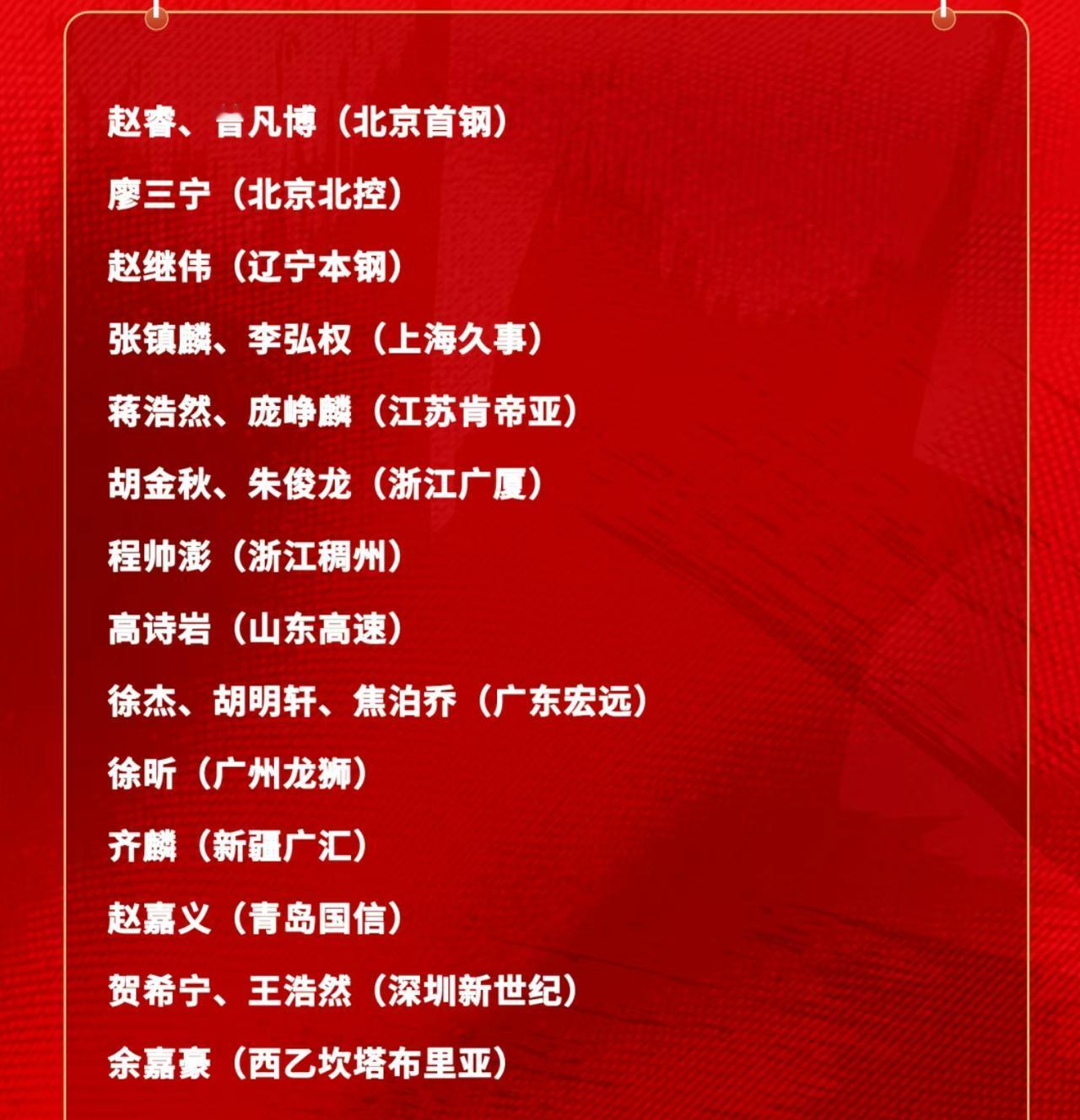 晚上10点!中国男篮大名单出炉:徐杰、庞峥麟入选,周琦无缘 随着CBA第一阶段的比赛结束,那么,中国男篮也将会迎来新的任务,没错,那就是参加2027年男篮世界杯,第二窗口期的比赛,在2月26日,中国男篮将会做客对阵日本队。考虑到,中国男篮已经连续输给韩国队,所以,对阵日本队的比赛,是中国男篮只能赢不能输的比赛。 为了准备与日本队的比赛,中国男篮主教练郭士强,在近段时间,也是在CBA赛场到处考察,为中国男篮物色球员。 值得一提的,在晚上10点20分,中国男篮也是正式公布了集训大名单,从大名单来看,此番入选的人员很多,达到了21人,其中,广东队入选的球员最多,达到了三人,分别是徐杰、胡明轩和焦泊乔。与此同时,CBA菜鸟球员庞峥麟,也是首次进入中国男篮集训队。 在此,我们就来看看,入选中国男篮集训大名的球员有哪些人: 广州队1人:徐昕; 新疆队1人:齐麟; 青岛队1人:赵嘉义; 浙江队1人:程帅澎; 山东队1人:高诗岩; 北控队1人:廖三宁; 辽宁队1人:赵继伟; 上海队2人:张镇麟、李弘权; 江苏队2人:蒋浩然、庞峥麟 广厦队2人:胡金秋、朱俊龙; 深圳队2人:贺希宁、王浩然; 北京队2人:赵睿、曾凡博; 广东队3人:徐杰、胡明轩、焦泊乔; 西乙坎塔布里亚队1人:余嘉豪。 从上述中国男篮大名单来看,一共来自14支球队,其中,CBA球队有13支,有5支球队送出了2名球员,广东队则送出了3名球员,是CBA入选中国男篮最多的球队。 不过,徐杰由于受到了伤病的困扰,他接下来,能否参加中国男篮集训,还真的不好说。广东队与上海队的比赛,徐杰也是没有参加。显然,这是一件遗憾的事情。 与此同时,北京队中锋周琦,也是因为伤病的因素,没有入选本届中国男篮大名单。众所周知,周琦是CBA第一中锋,他无法参加比赛,对于中国男篮来讲,也是一个重大的损失。 当然了,由于参加比赛的只有12名球员,也就是说,上述球员,还有9人会被淘汰出局。那么,谁会最终代表中国男篮参加与日本队的比赛呢?我们就拭目以待吧。