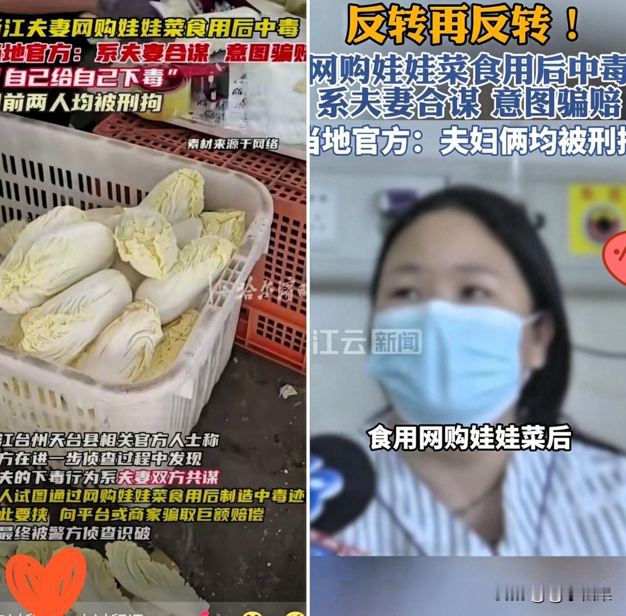 年度最蠢碰瓷!夫妻吃老鼠药讹娃娃菜商家,结果把自己送局子,这操作真的离谱到家了! 浙江一对夫妻网购娃娃菜,竟想出用老鼠药自毒来讹钱的歪招。他们偷偷往菜里撒药吃下,装中毒进ICU,转头就向平台索赔,还演得声泪俱下,连村干部都被蒙骗,网友也跟着指责商家。可警方一查就真相大白,只有他们吃的菜里有毒,家里还搜出同款鼠药,谎言瞬间被戳穿。 本想靠碰瓷赚快钱,结果涉嫌诈骗和投放危险物质罪,直接把自己送进了局子。为了点利益拿命冒险,不仅坑了无辜商家,还把自己的人生搭进去,真是又蠢又坏。这种毫无底线的行为,终究逃不过法律的制裁,也给所有人提了醒,歪门邪道走不通,踏实做人做事才是正道!