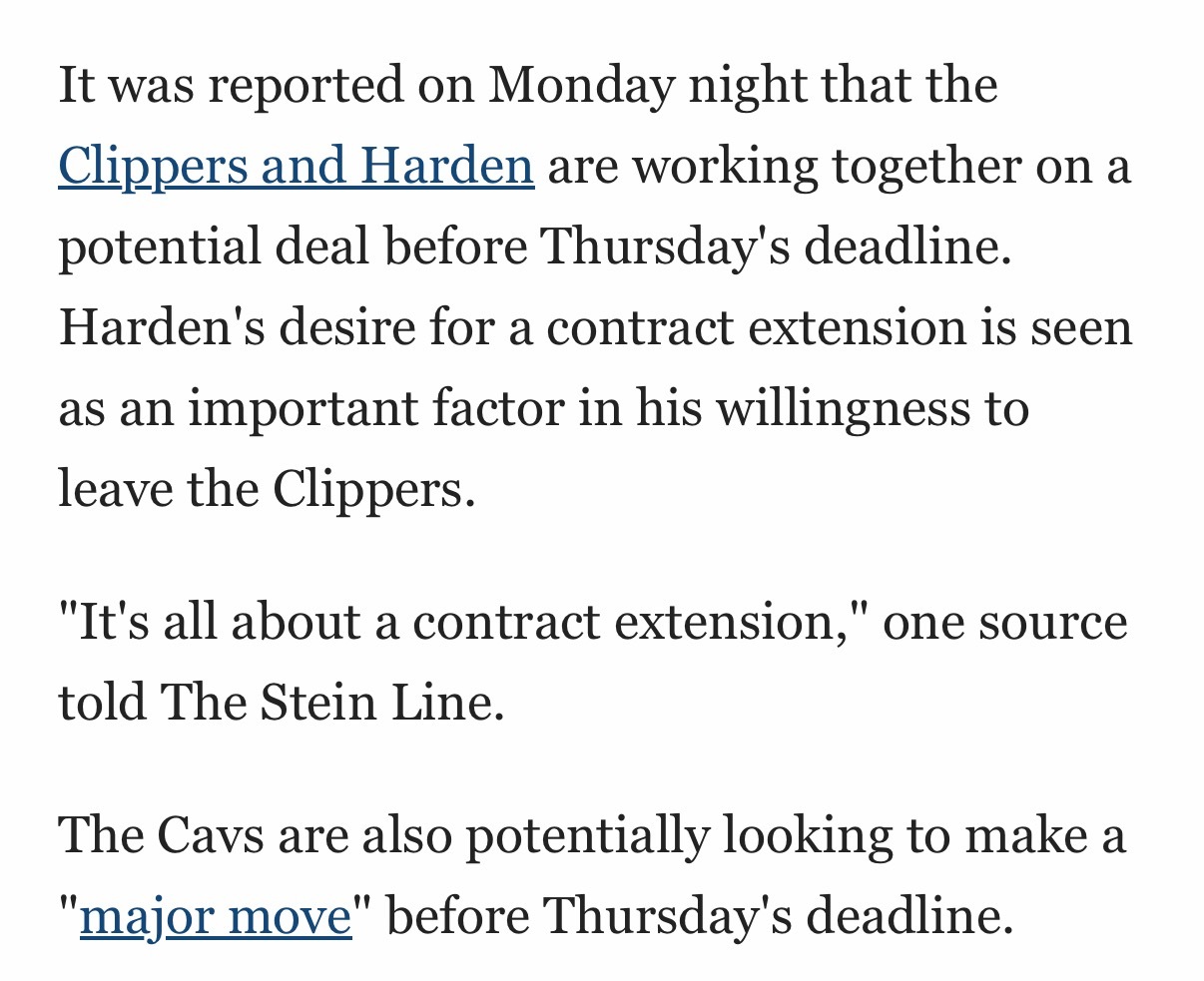 Stein:1. 快船和骑士关于交易哈登的谈判还没有进入“最终阶段”(advanced stage)2. 双方谈判范围还包括柯林斯和博格丹3. 重要因素之一是快船和哈登的续约谈判(没谈拢)