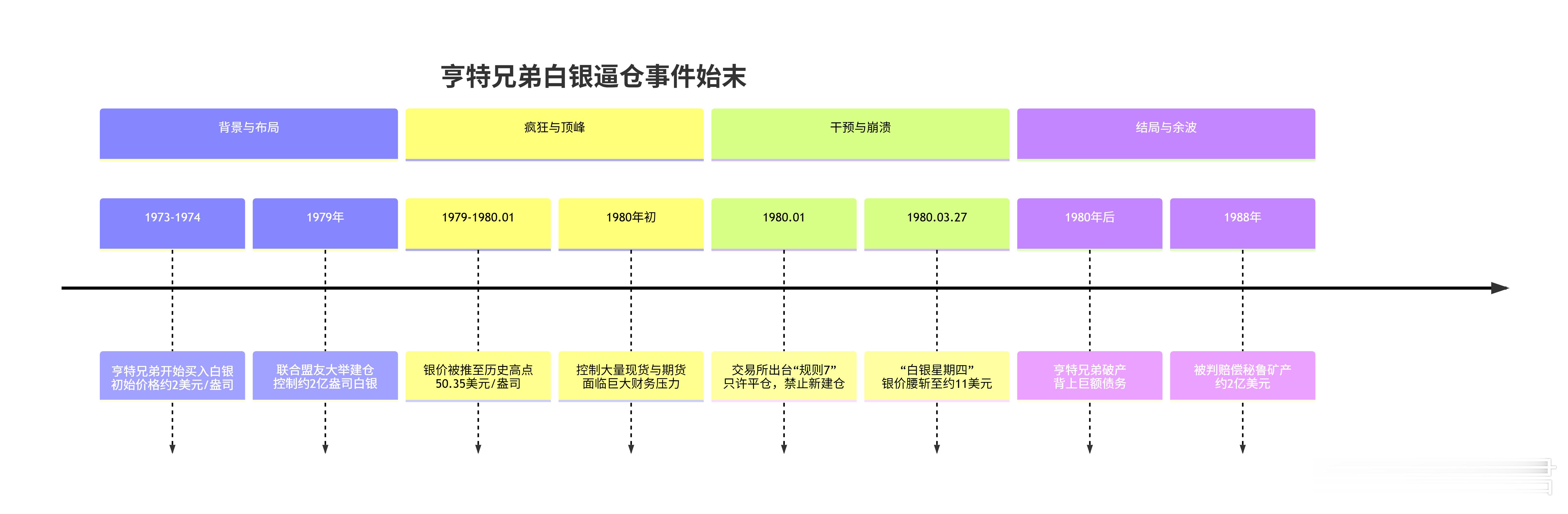 共识的建立轰轰烈烈,其崩塌却往往在一瞬之间。两次白银狂潮都精准地演绎了这一剧本。1980年初,亨特兄弟将银价推升至每盎司50美元的史前高度。然而,他们的整个帝国建立在巨大的债务杠杆之上。当交易所为抑制投机而大幅提高保证金比例,甚至出台“只许平仓”的规则时,亨特兄弟的资金链瞬间断裂。银行开始索还贷款,他们被迫抛售白银,导致价格如山崩般坍塌,当年3月单月跌幅就达62%。一场针对空头的完美逼仓,最终以多头的集体埋葬告终。