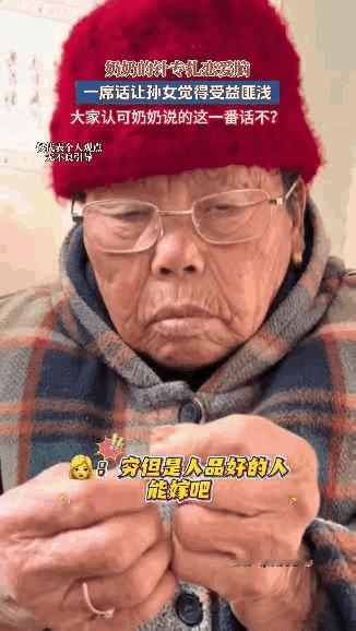 这个奶奶火了! 一番话直接扎醒无数恋爱脑年回‮过娘姑苏江 !了实真台 !家,问奶奶:穷但人品好的人,能嫁吗? 她本来以为,奶奶会说人品最重要,没想到老人一句话,把她瞬间点醒。 奶奶说得特别实在:人品好是基本,不是用来抵消穷的理由。 手脚好好的,连自己日子都过不明白,还总让女生付出、只会画大饼,那不叫人品好,叫没担当、不上进。 柴米油盐的日子里, 空有温柔体贴撑不了多久,一直穷还不思进取,才最磨人。 婚姻不是扶贫,是两个人一起扛生活,不是一个人单方面兜底。 没有说教,全是过来人的大实话,难怪女生看完直呼被点醒,再也不盲目恋爱脑。 你觉得,好人品和过日子的能力,哪个更重要?